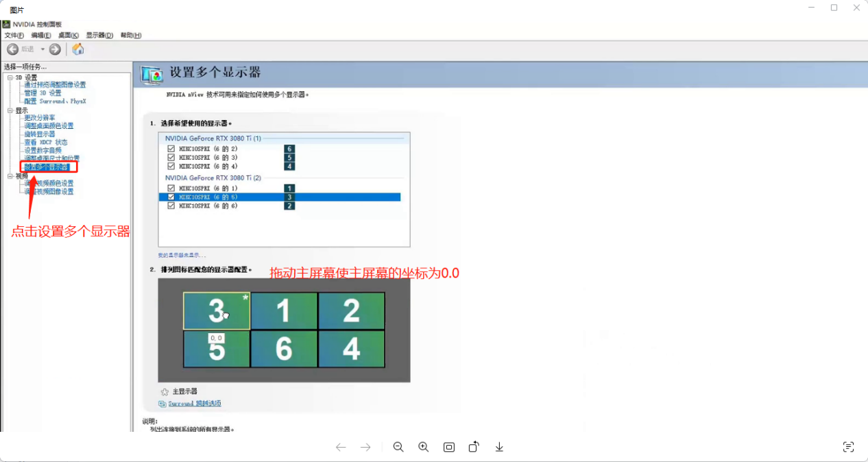 - 在"设置多个显示器"选项设置每个显示器的坐标参数:显示通道3(0,0)、显示通道1(1920,0)、显示通道2(3840,0)、显示通道5(0,1080)、显示通道6(1920,1080)、显示通道4(3840,1080)、如下图所示: