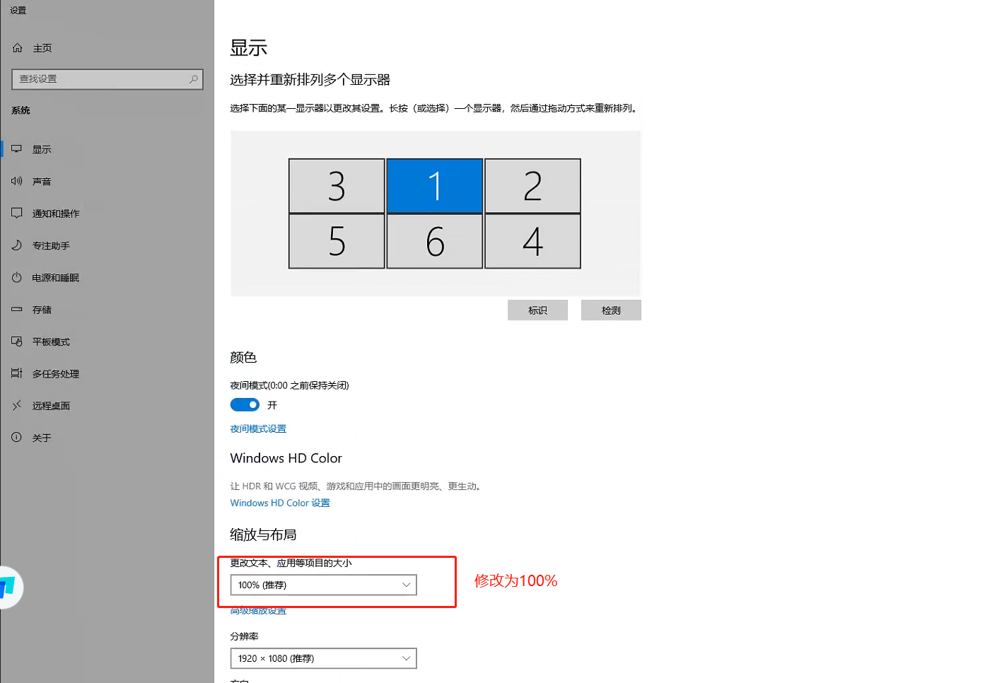 - 右键桌面, 在弹出的菜单点击打开"显示配置",把每个显示器的文本、应用等项目的大小改为"100%",修改完成后重启电脑。如下图所示:
