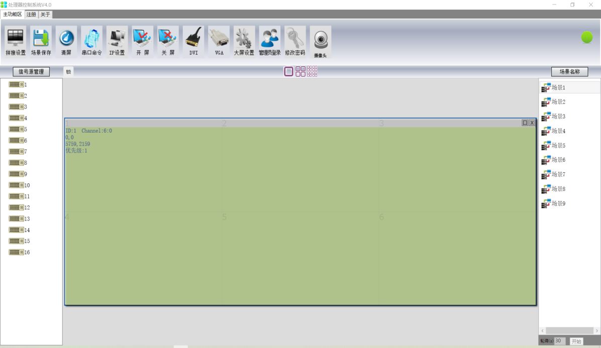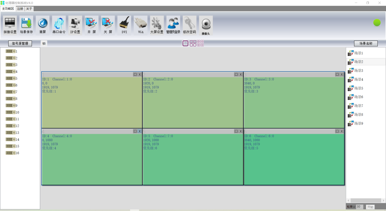 LCD\LED融合巨屏一般是由多个小分辨率的显示屏接入拼接处理器组合完成,在现场使用时通常会使用拼接处理器厂家提供的融合拼接软件划分多种显示单元组合场景模式,下面以6个显示单元拼接组合为例: