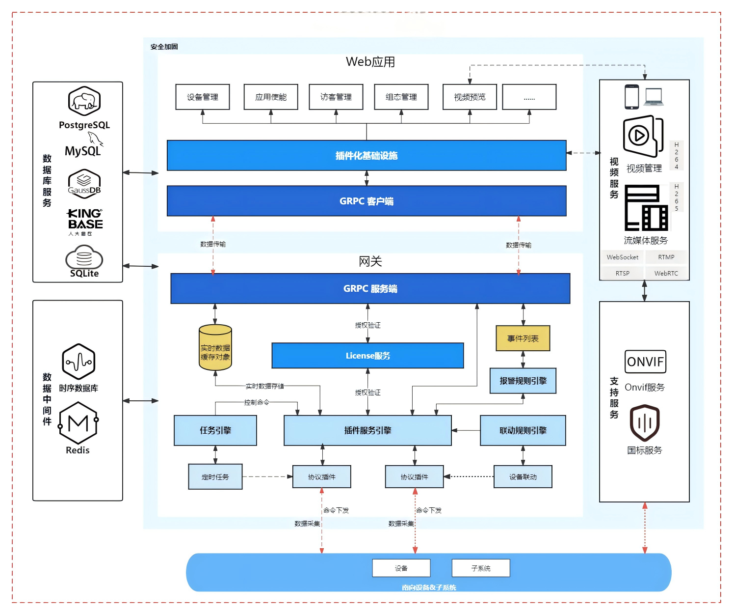 - gRPC服务端处理通信,License服务负责认证,任务引擎调度任务,插件服务引擎加载协议插件,报警与联动规则引擎处理告警逻辑。