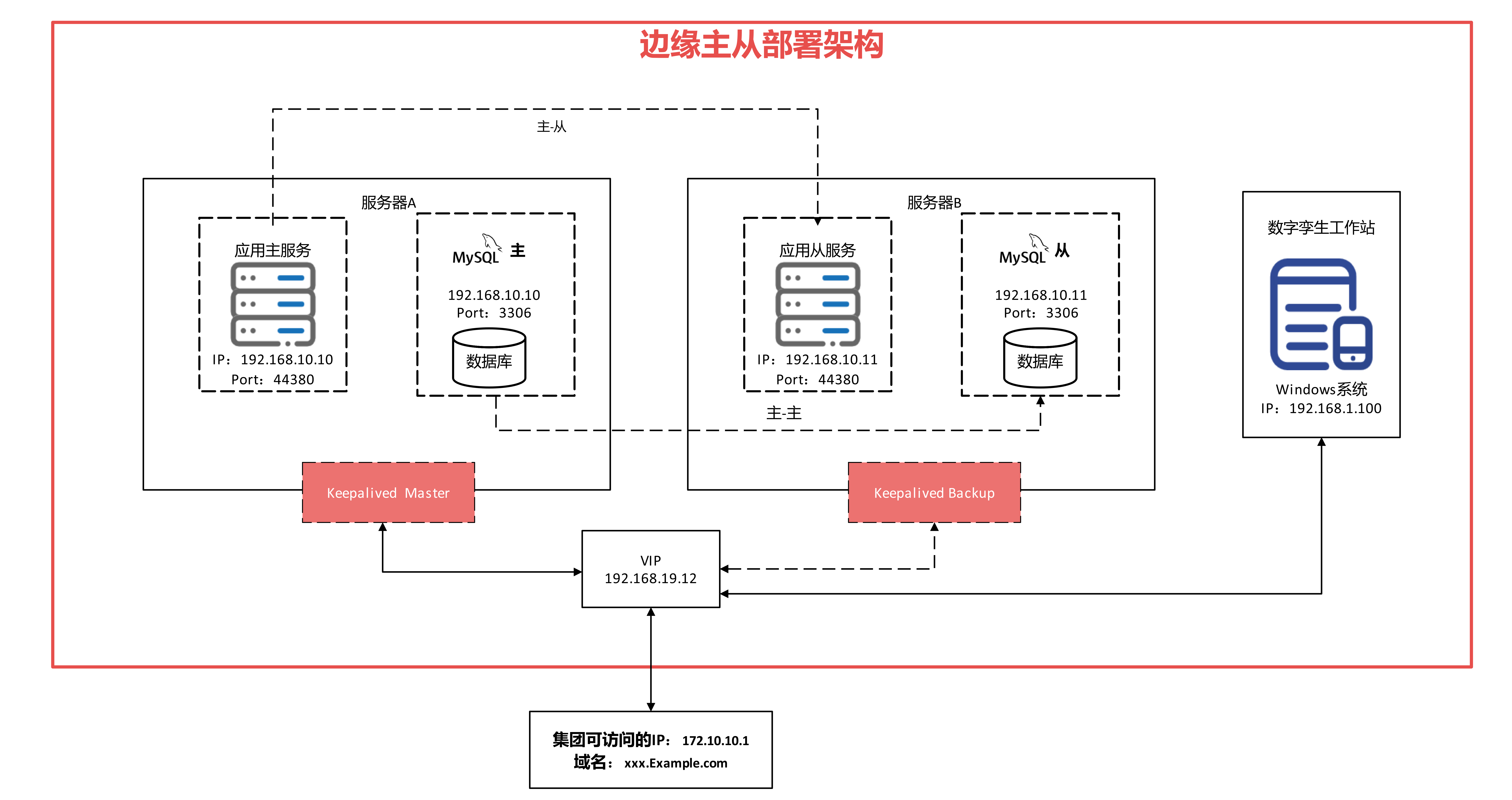 - 通过 Keepalived 工具实现故障转移,并共同绑定一个虚拟IP(VIP: 192.168.19.12) 对外提供服务。客户端只需访问VIP,由Keepalived自动将流量导向当前的主服务器,实现业务无缝切换。
