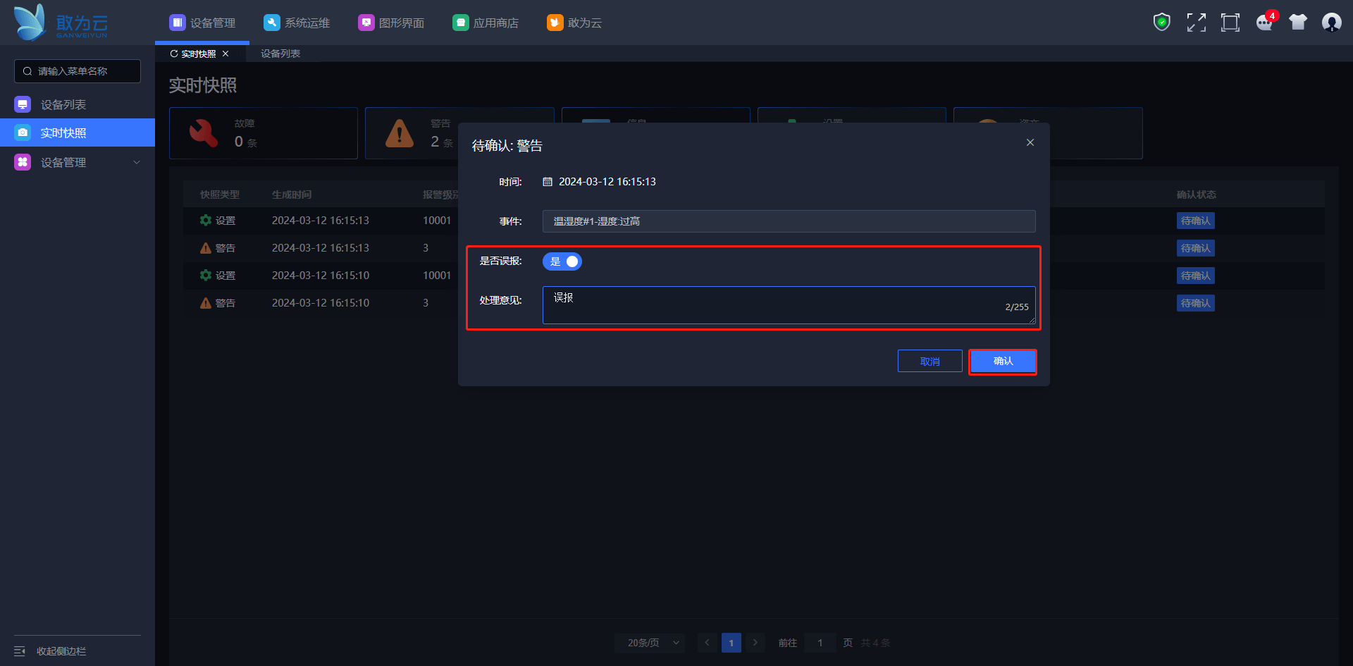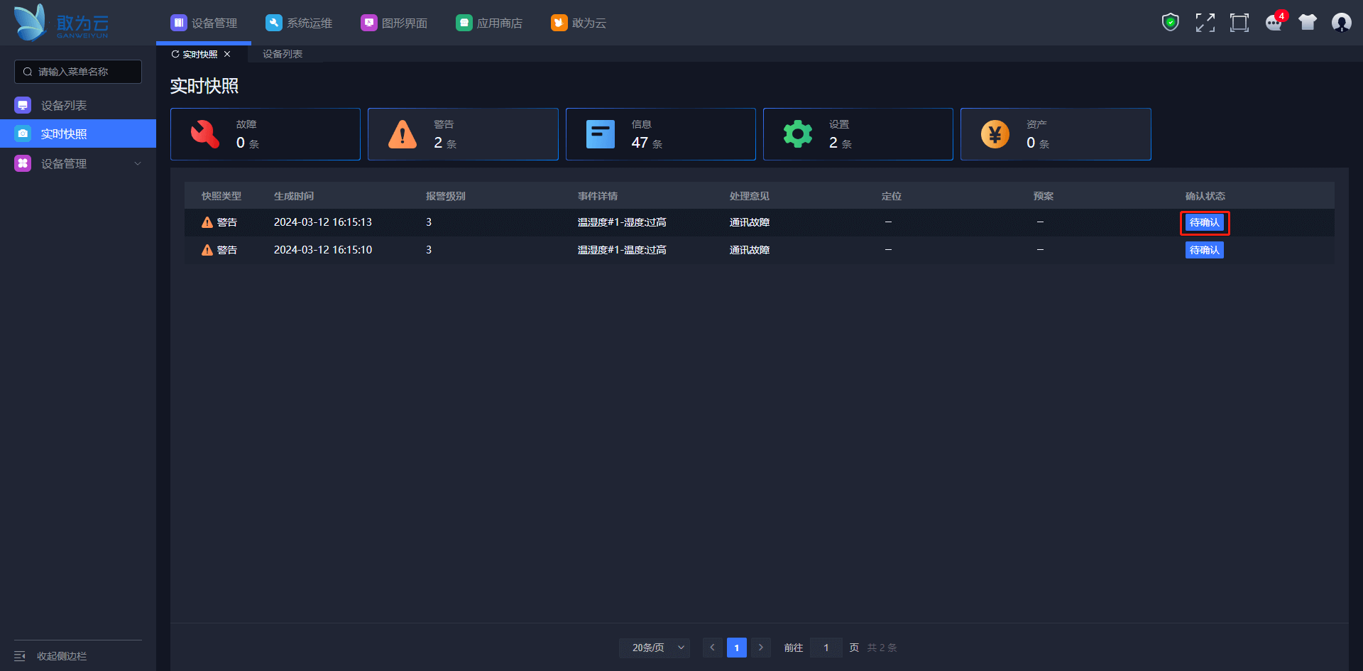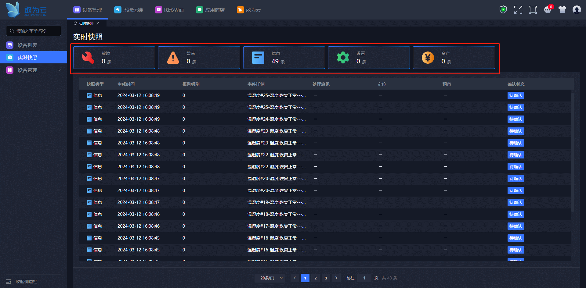 点击确认,实时快照中警告少一条,信息多一条,设备列表测点变成绿点,并且可在事件查询中查询到确认信息。