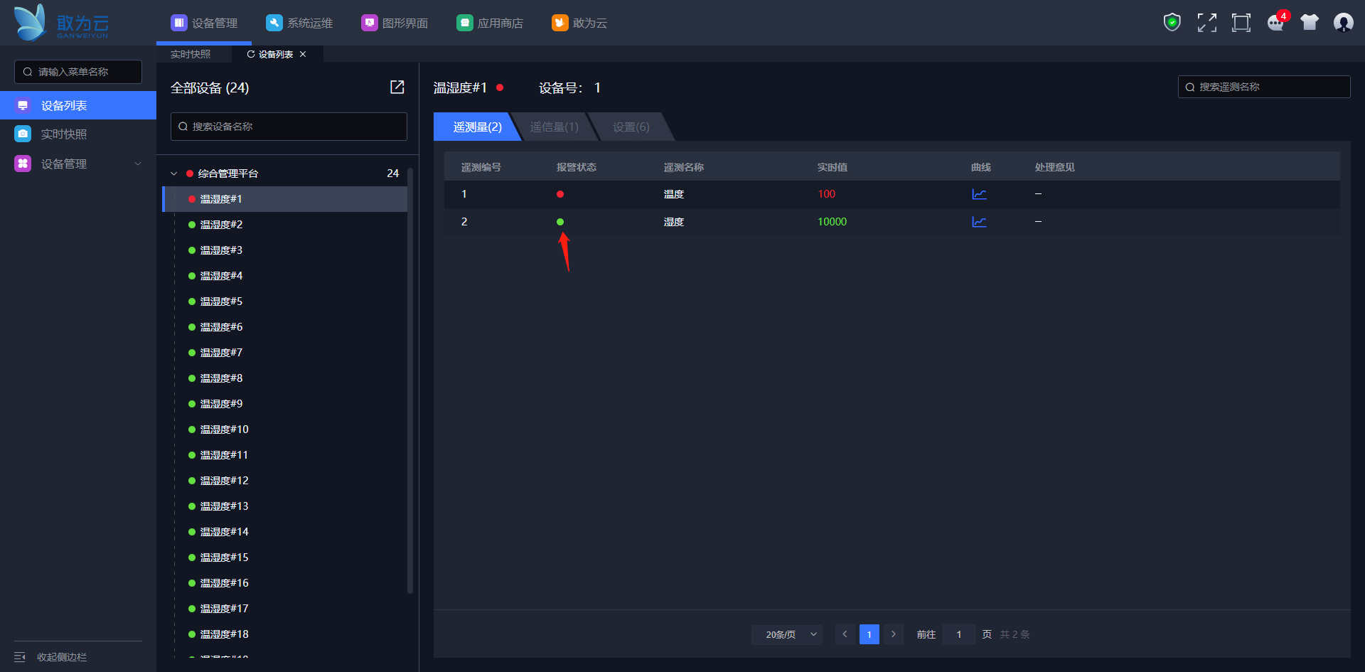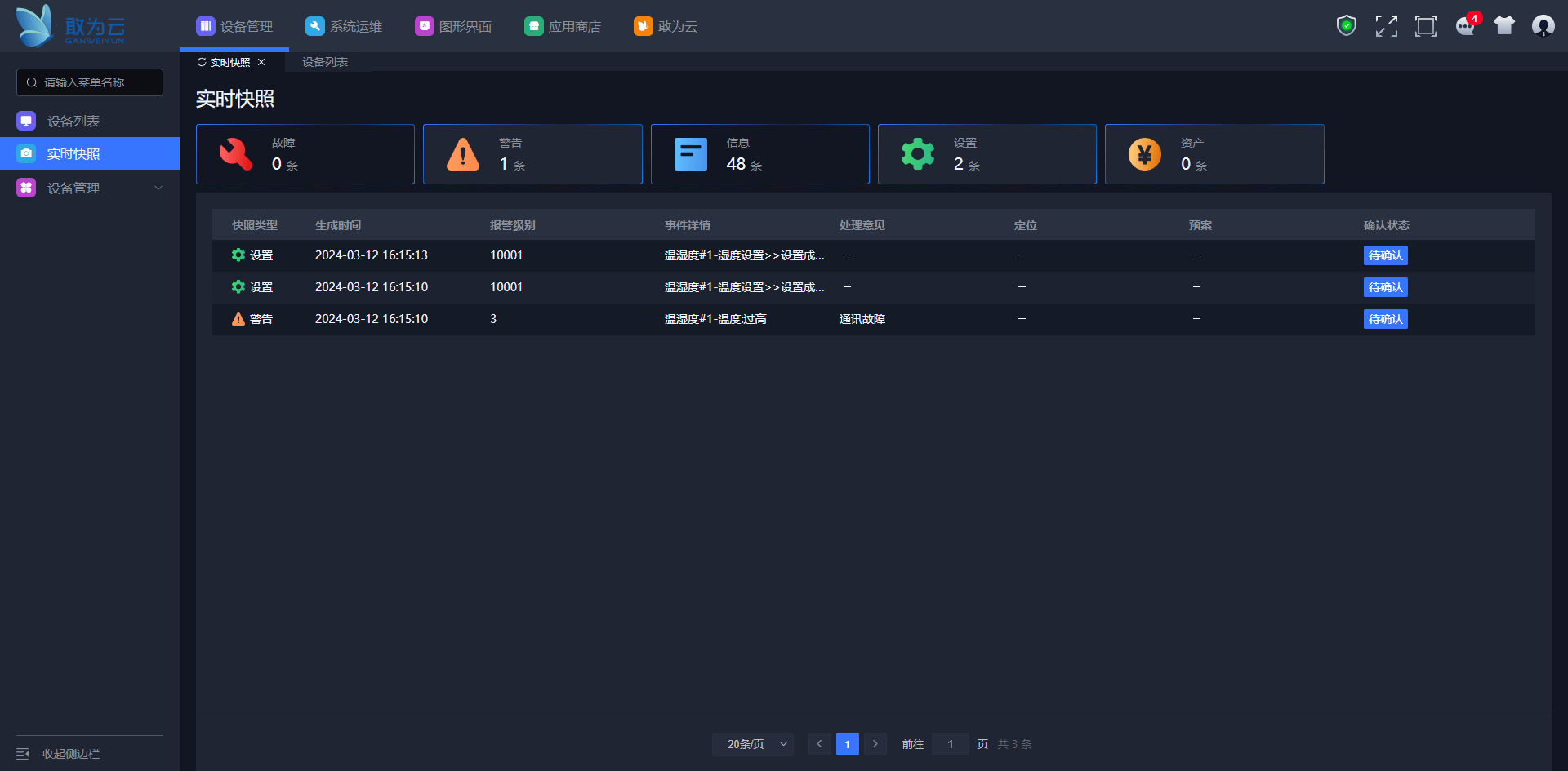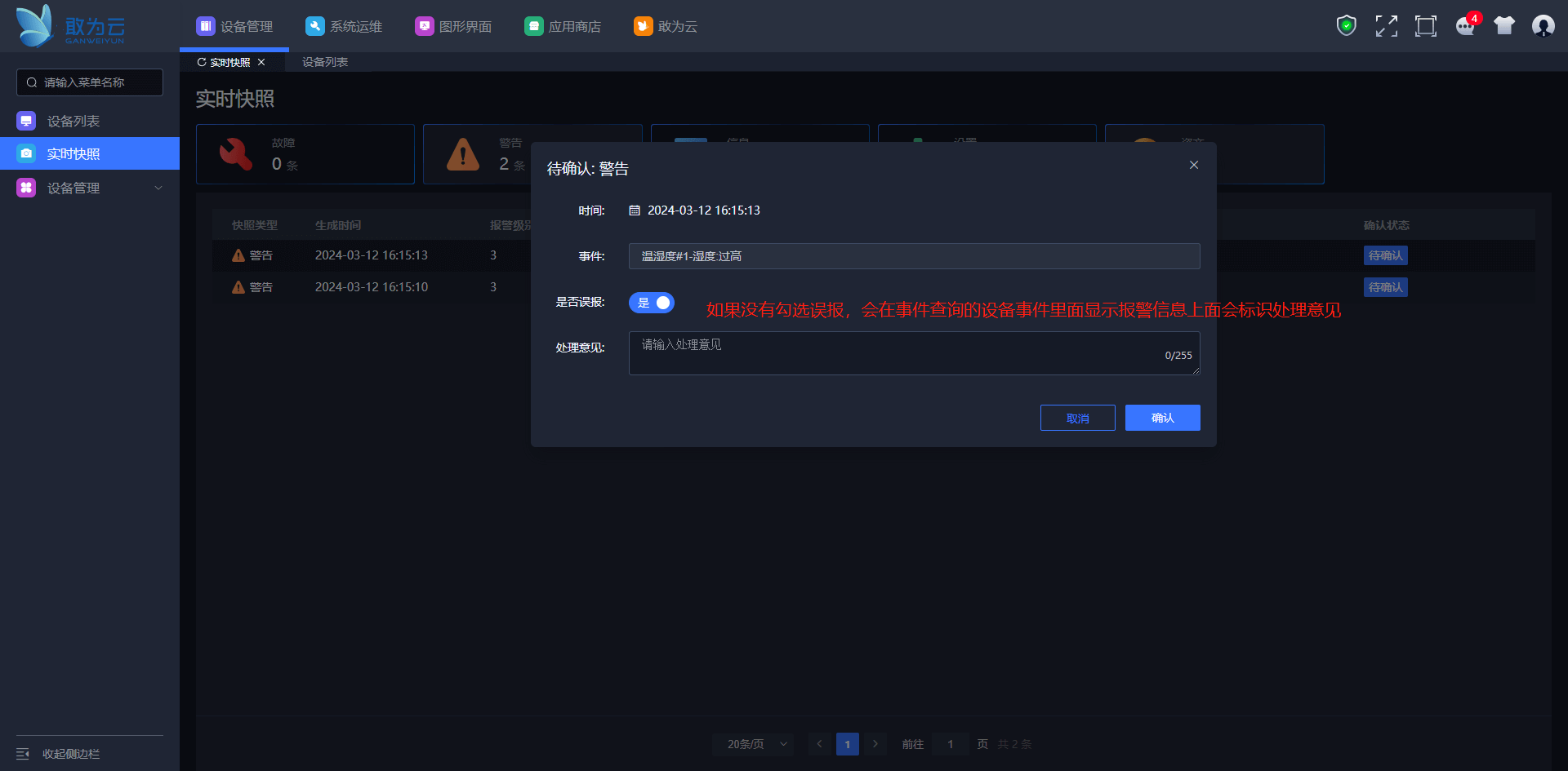 点击确认,实时快照中警告少一条,信息多一条,设备列表测点变成绿点,并且可在事件查询中查询到确认信息。