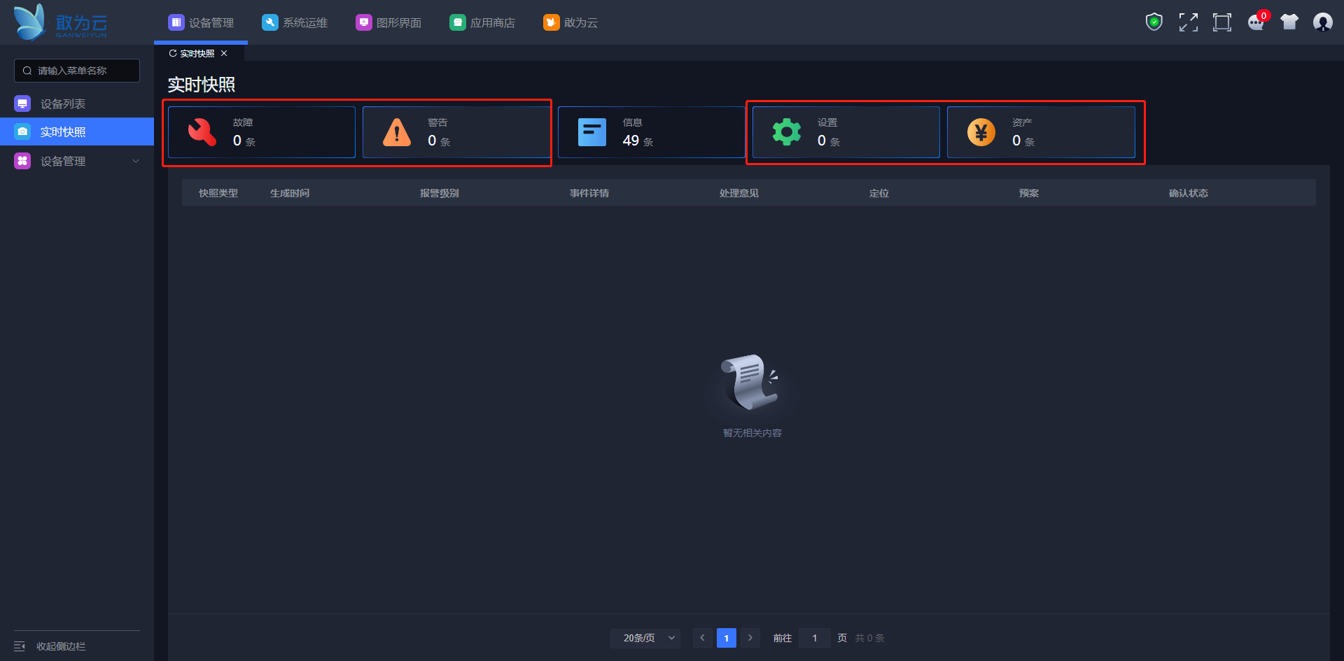 实时快照可实时显示系统的各类型信息,并支持告警统计,告警过滤及告警确认。