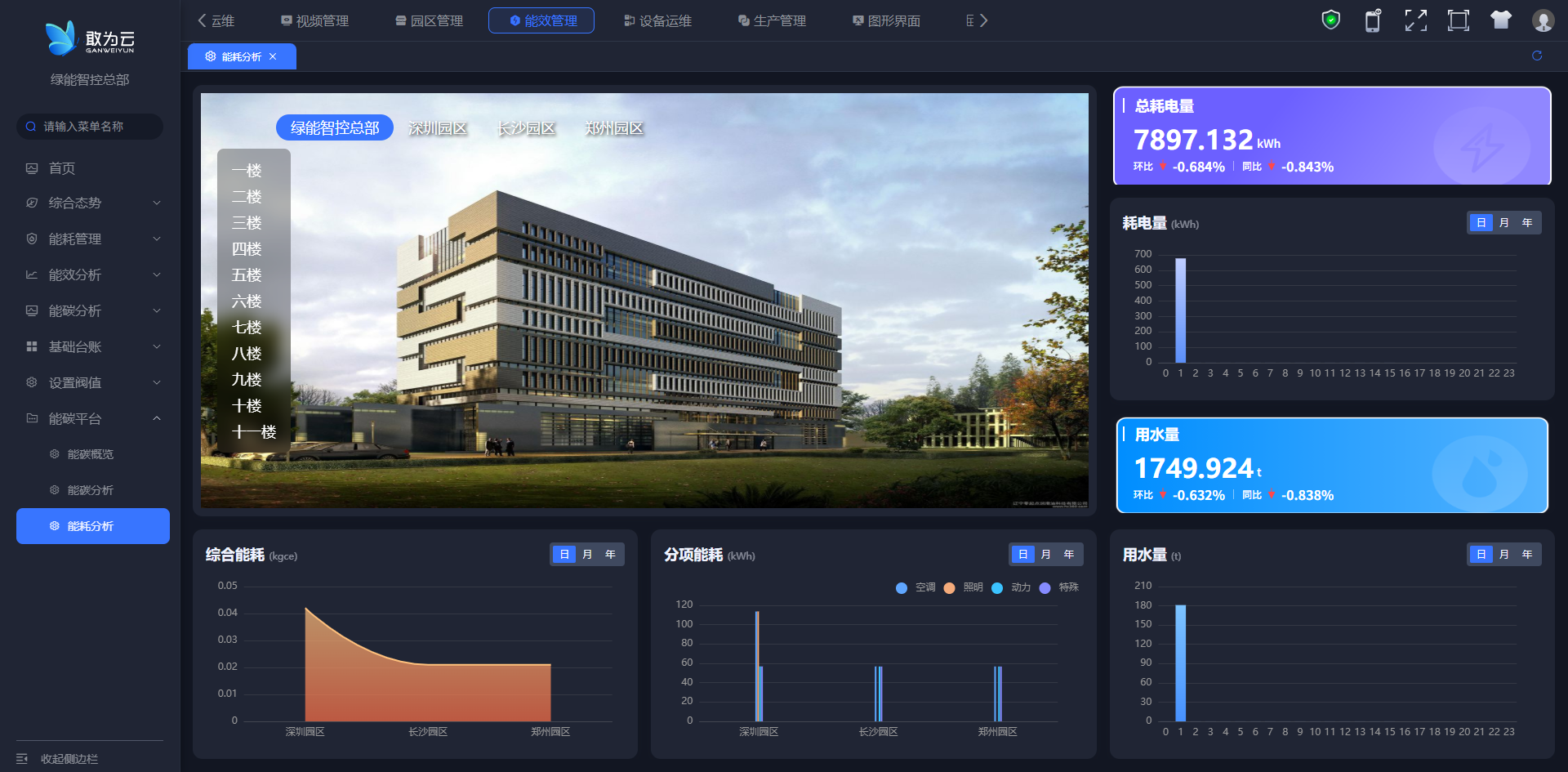 - 园区选择:用户可以通过选择想要查看的园区,比如敢为智控中心、深圳、长沙、郑州等园区,方便用户查看不同园区的能源概况。