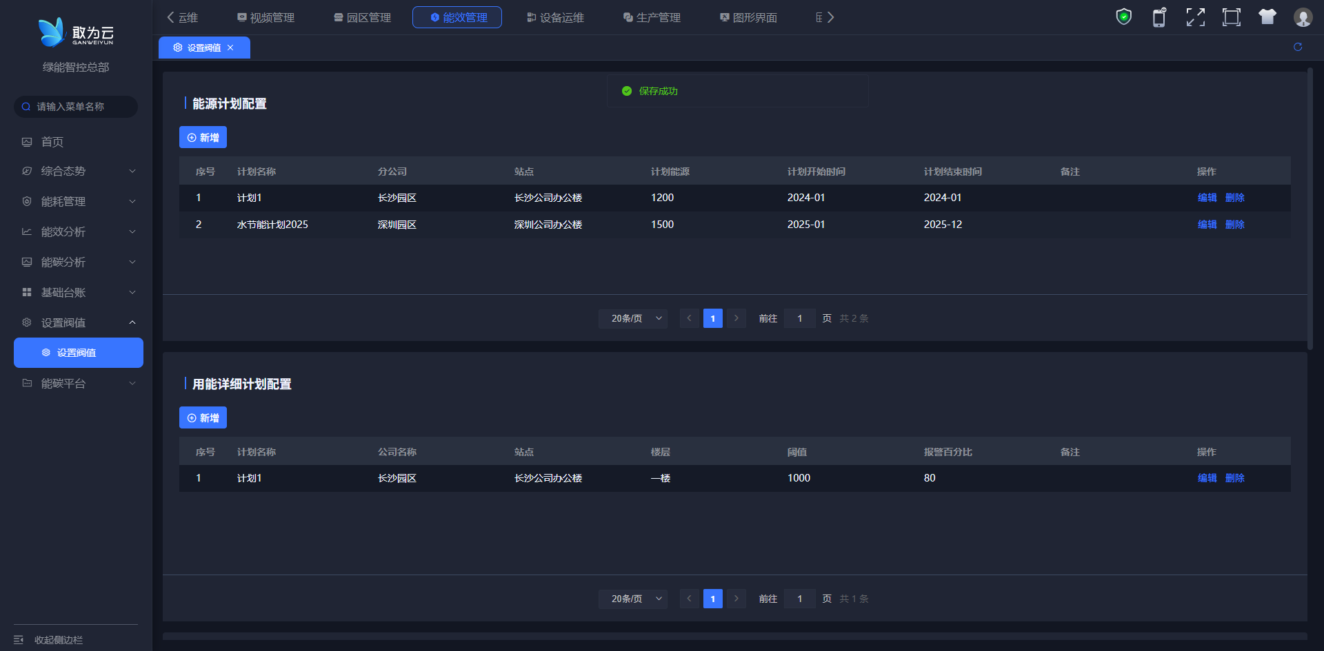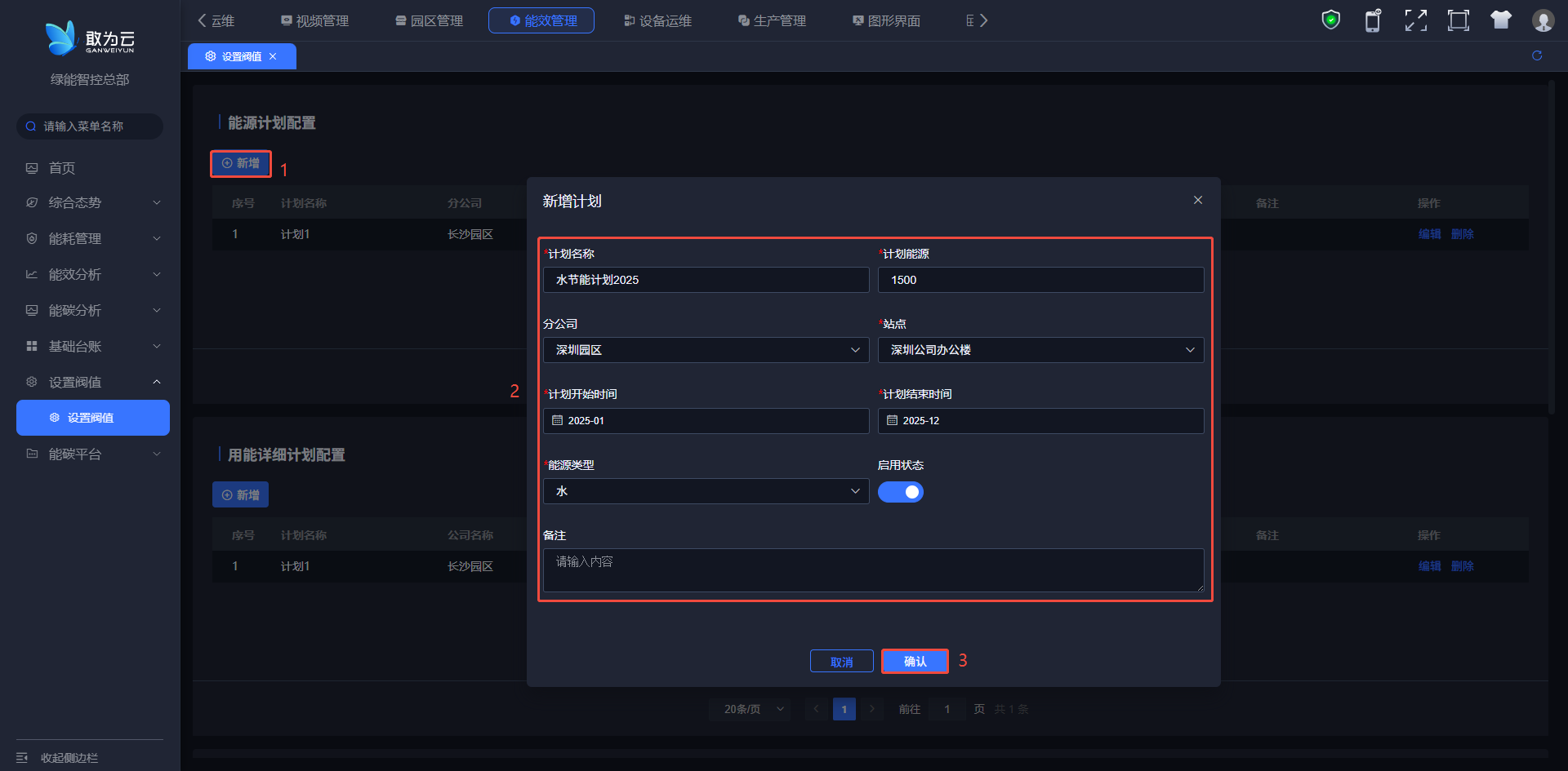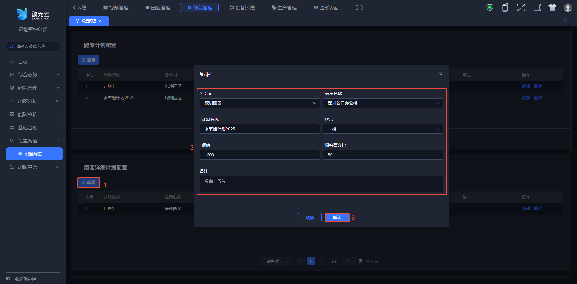 | 6 | 设置阈值 | 用于添加能源计划配置、 用能详细计划配置 |