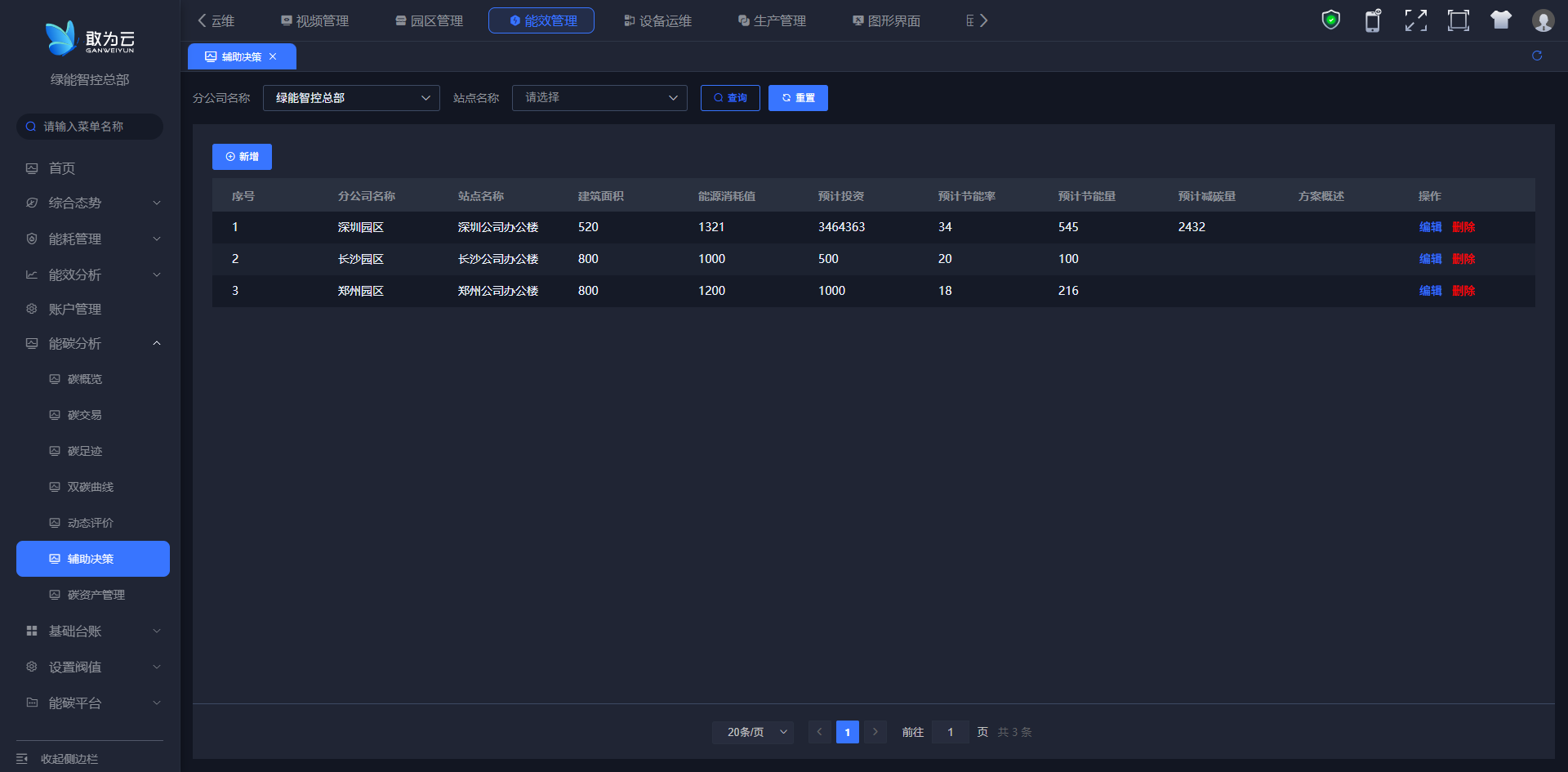 | 8 | 能碳分析 | 用于展示园区能碳排放总览、碳分析柱状图 |