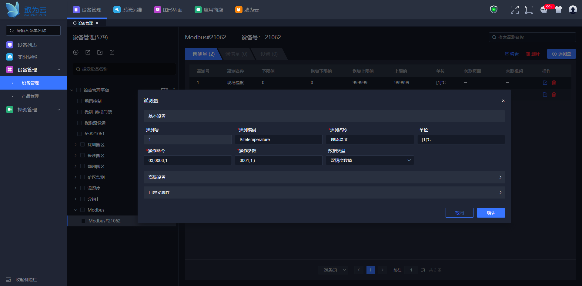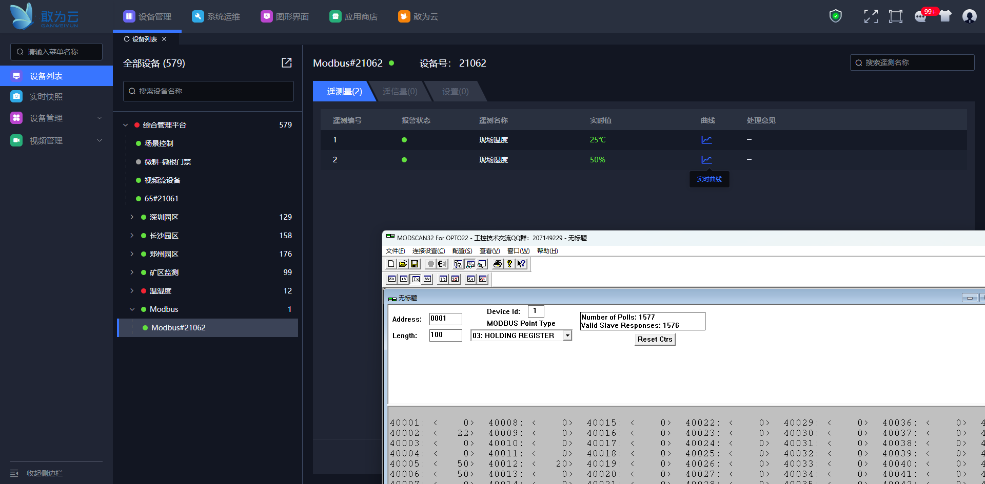 - 点击设备列表中的Modbus设备,在遥测的实时数据中可以获取到当前的模拟数据