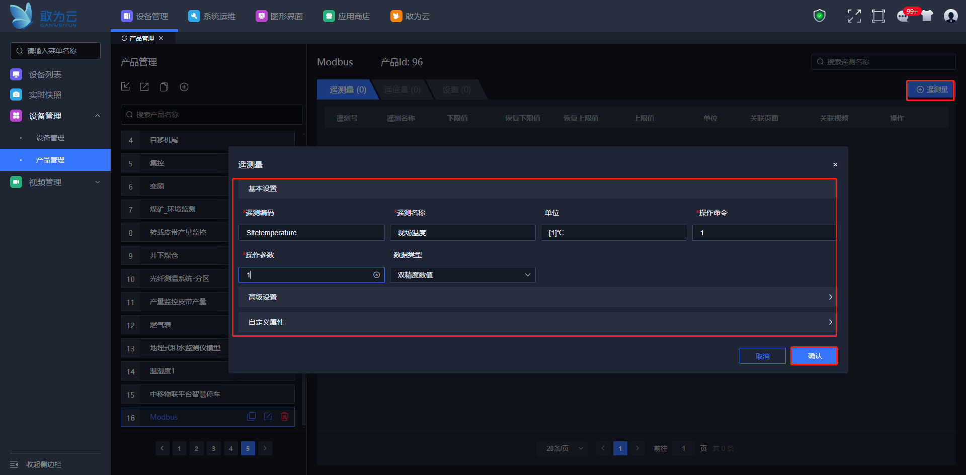 当前添加遥测是为了构造出一个产品模型出来,当前产品的遥测的可随意填写。