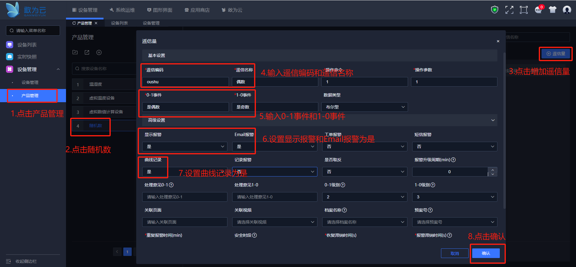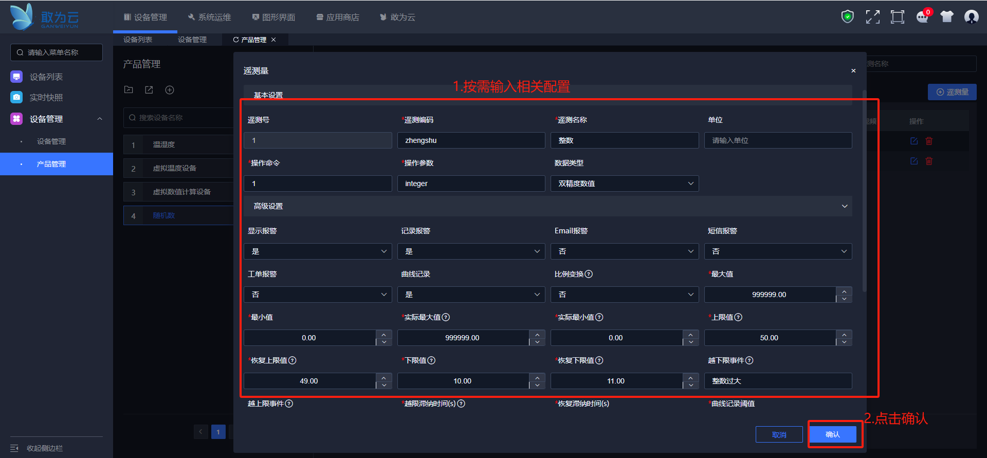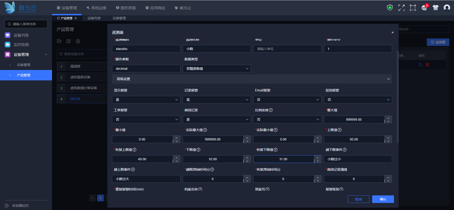 输入遥测编码和名称,设置操作参数为integer,设置报警范围及报警信息