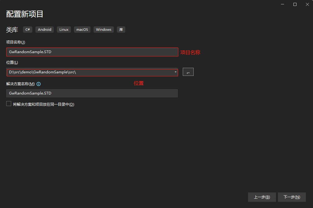 将项目名称命名为GwRandomSample.STD,并将该项目保存在上述src文件夹下。