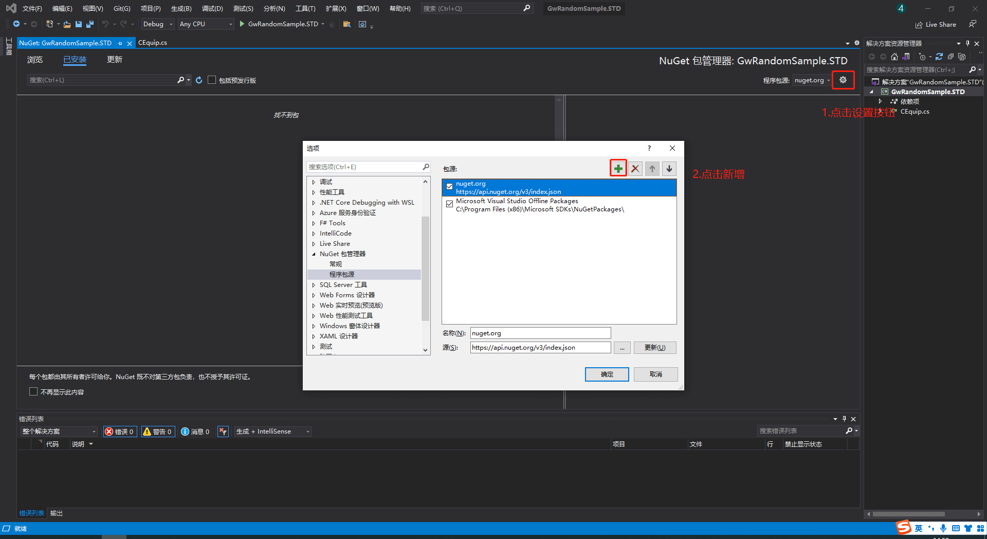 点击程序包源右侧的设置按钮,在弹出的对话框中点击新增按钮。