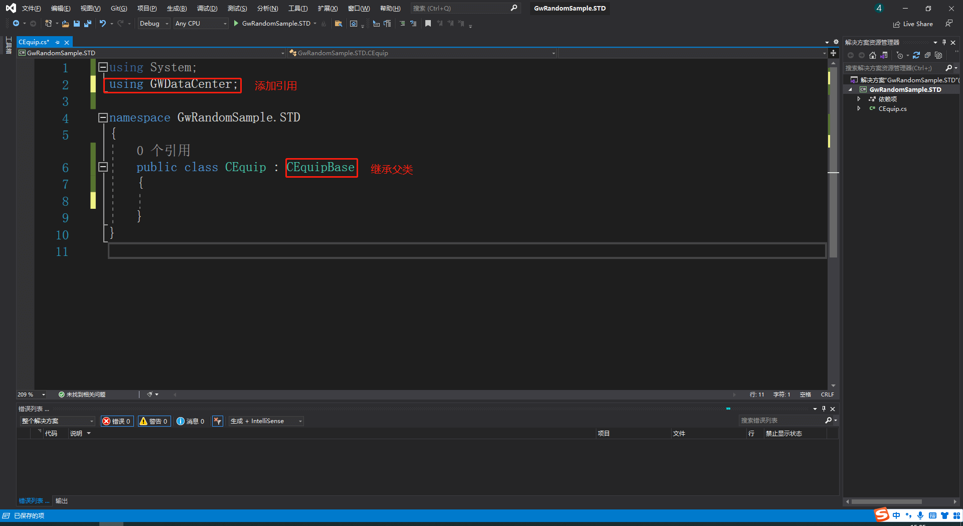 添加GWDataCenter的命名空间引用,并继承CEquipBase类。