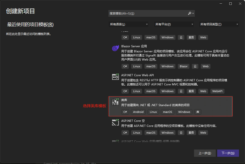 创建类库项目,其类型为面向.NET Standard和.NET Core的项目。