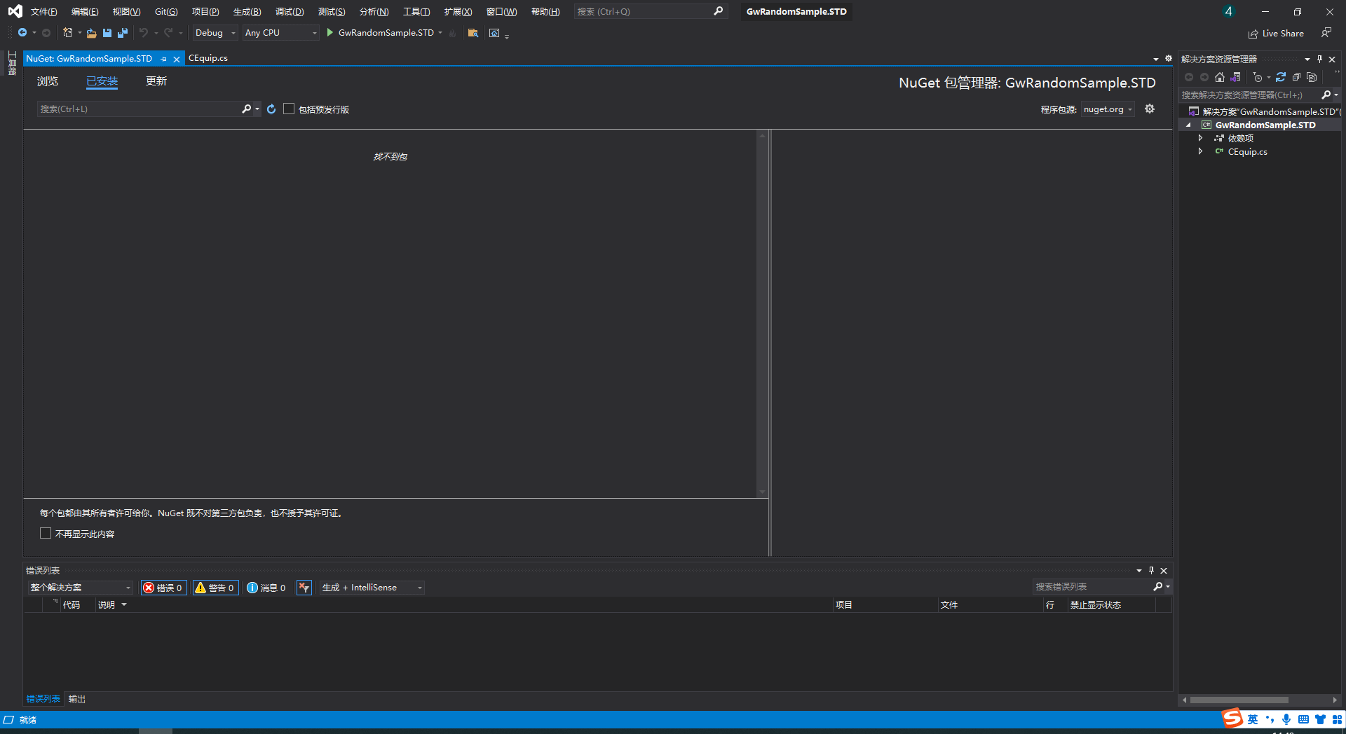 在解决方案资源管理器中右击项目选择管理NuGet程序包。