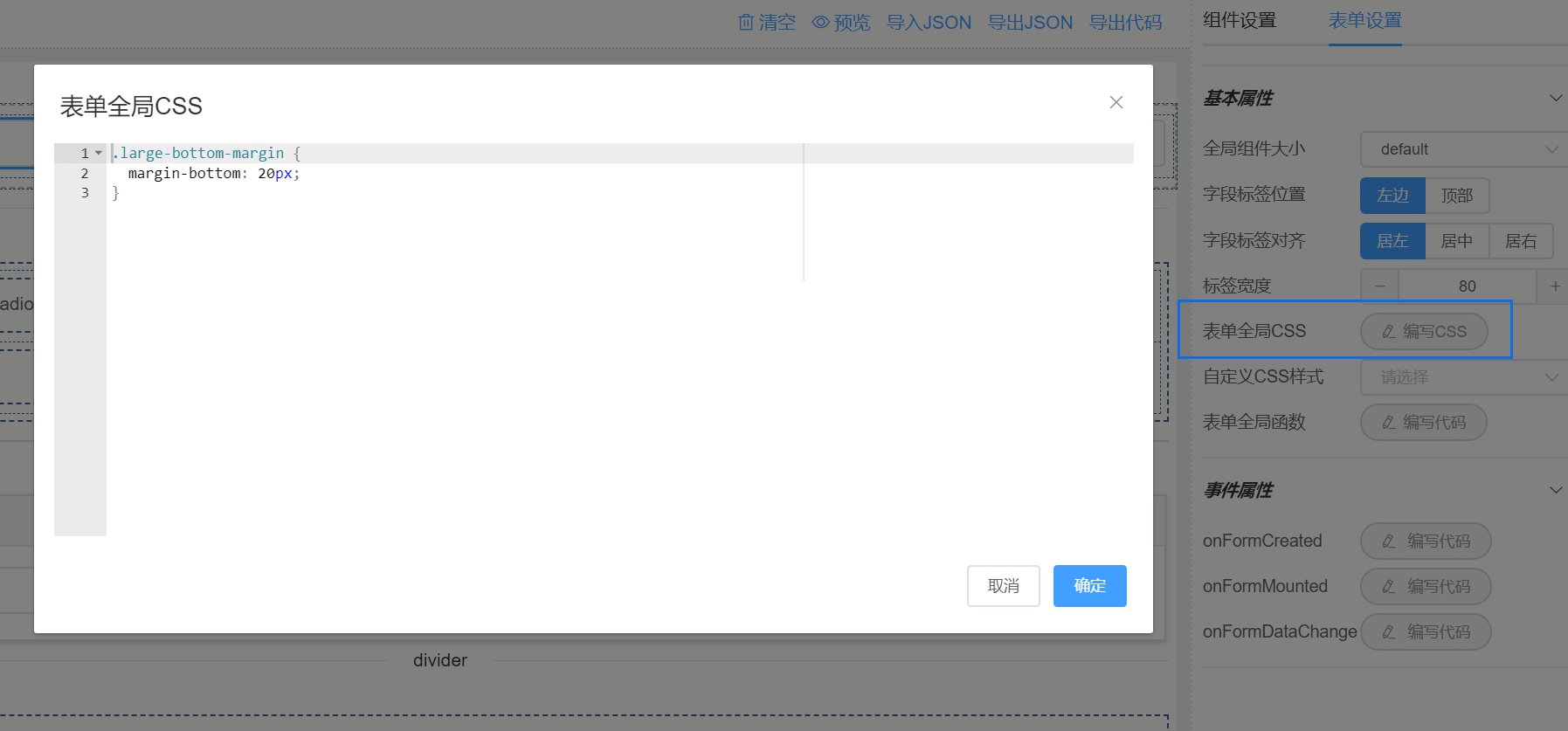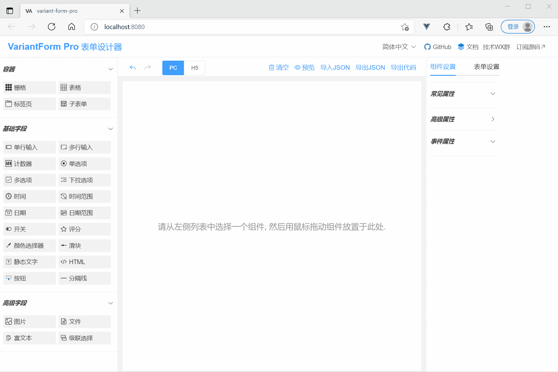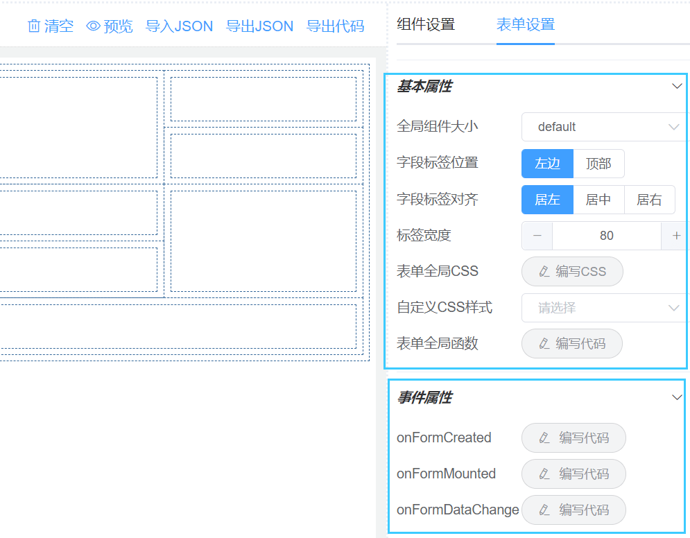 /* 注意:formJson是指表单设计器导出的json,此处演示的formJson只是一个空白表单json!! */