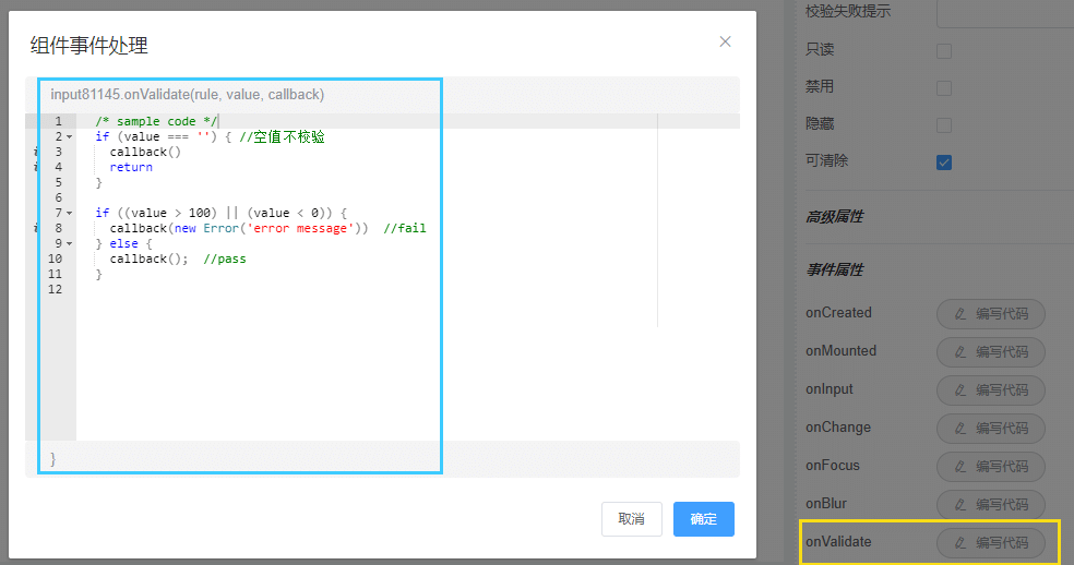 上述代码了共加载了9个属性编辑器,其中包含onClose事件编辑器,其他属性使用预先加载的默认属性编辑器。以上使用到的字符串资源分别位于src/lang/zh-CN_extension.js、src/lang/en-US_extension.js两个文件中。