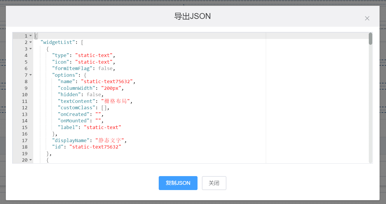 因为formItemFlag设置为false,故此处必须使用static-content-wrapper包裹组件(如formItemFlag设置为true,则应使用form-item-wrapper包裹组件),5~8行代码对应options属性值的动态绑定,handelCloseCustomEvent方法处理了自定义事件onClose交互逻辑。