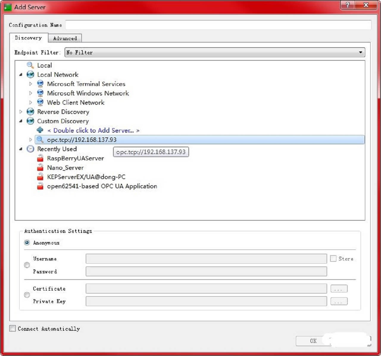 这个怎么说呢,这对使用者来说,就不需要去看设备的程序或配置,也不需要再去找什么点表等等,OPC UA 客户端就可以获取当前连接设备的变量。也就是这个设备有什么变量,客户端都能搜索出来了,这个可以说是非常有用的。