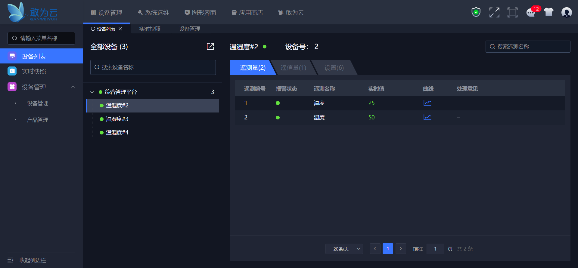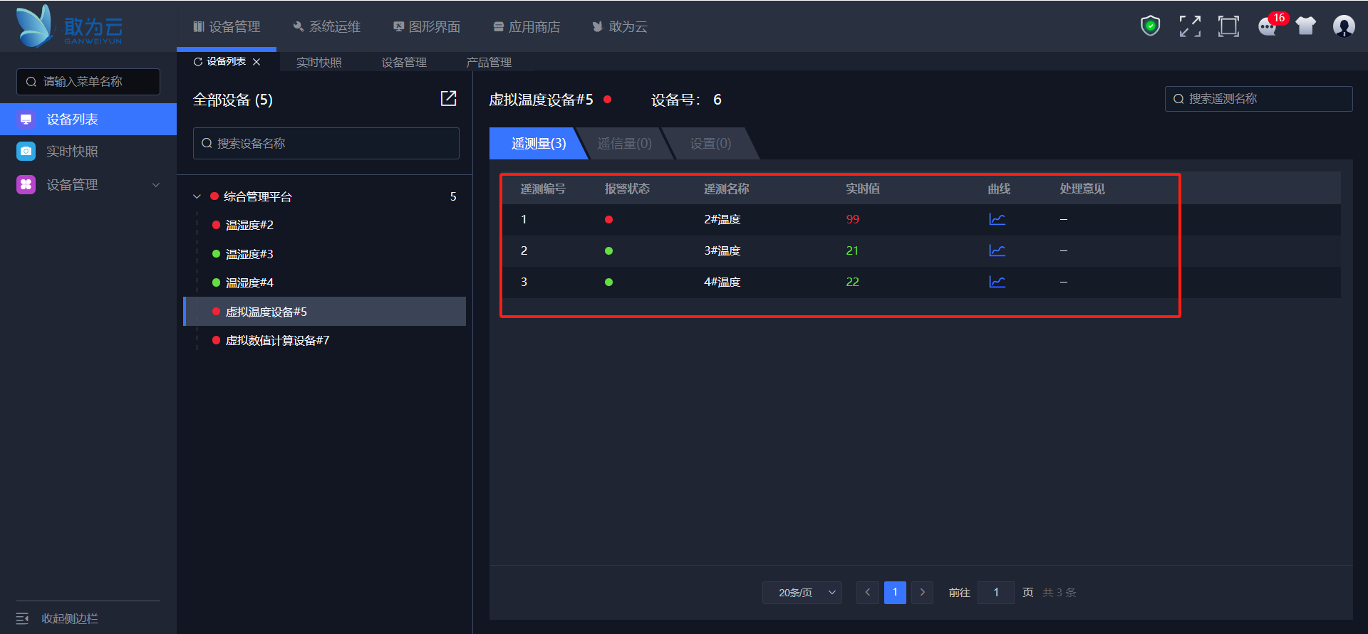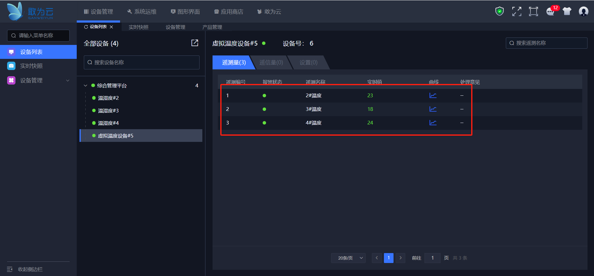 添加完成后可以在设备列表中的虚拟温度设备中看到三个温湿度设备的温度实时值。