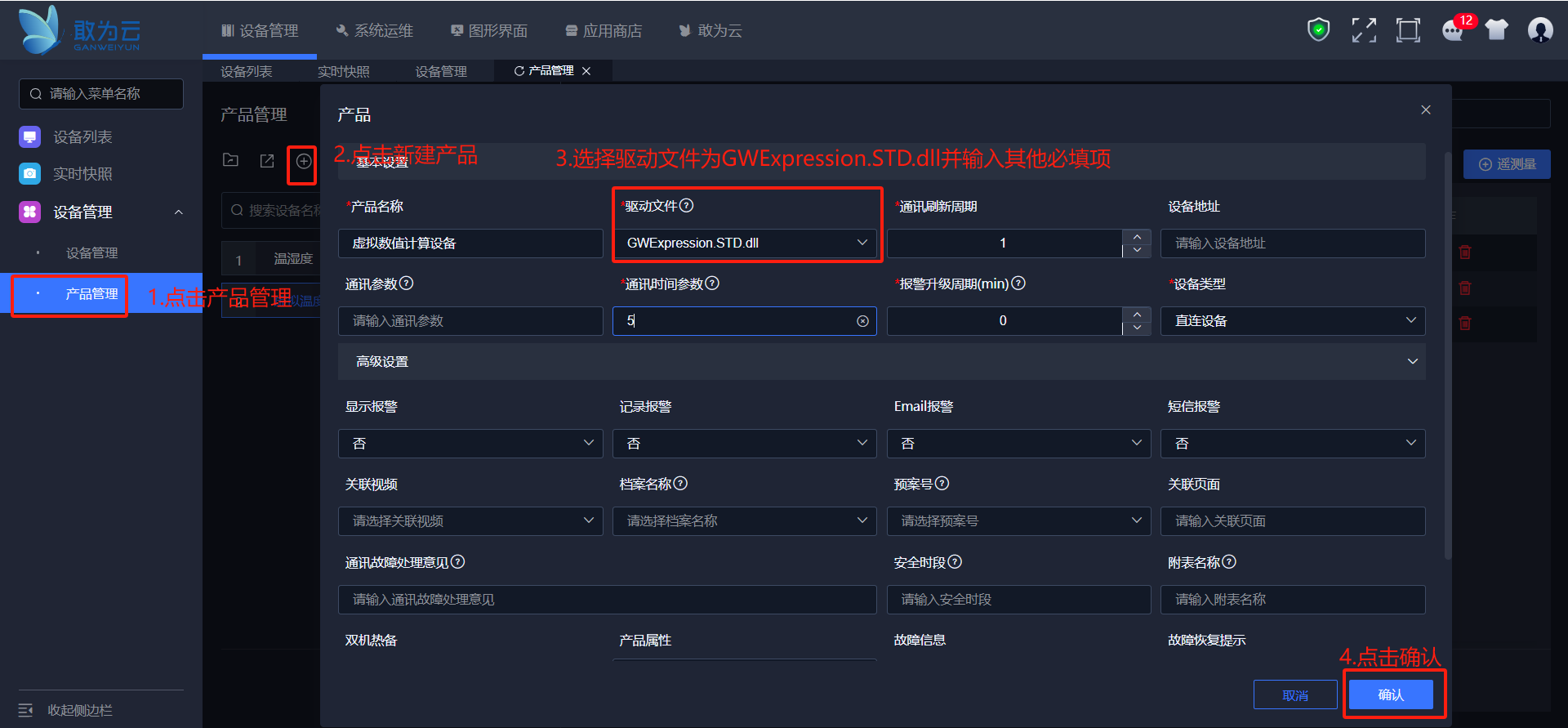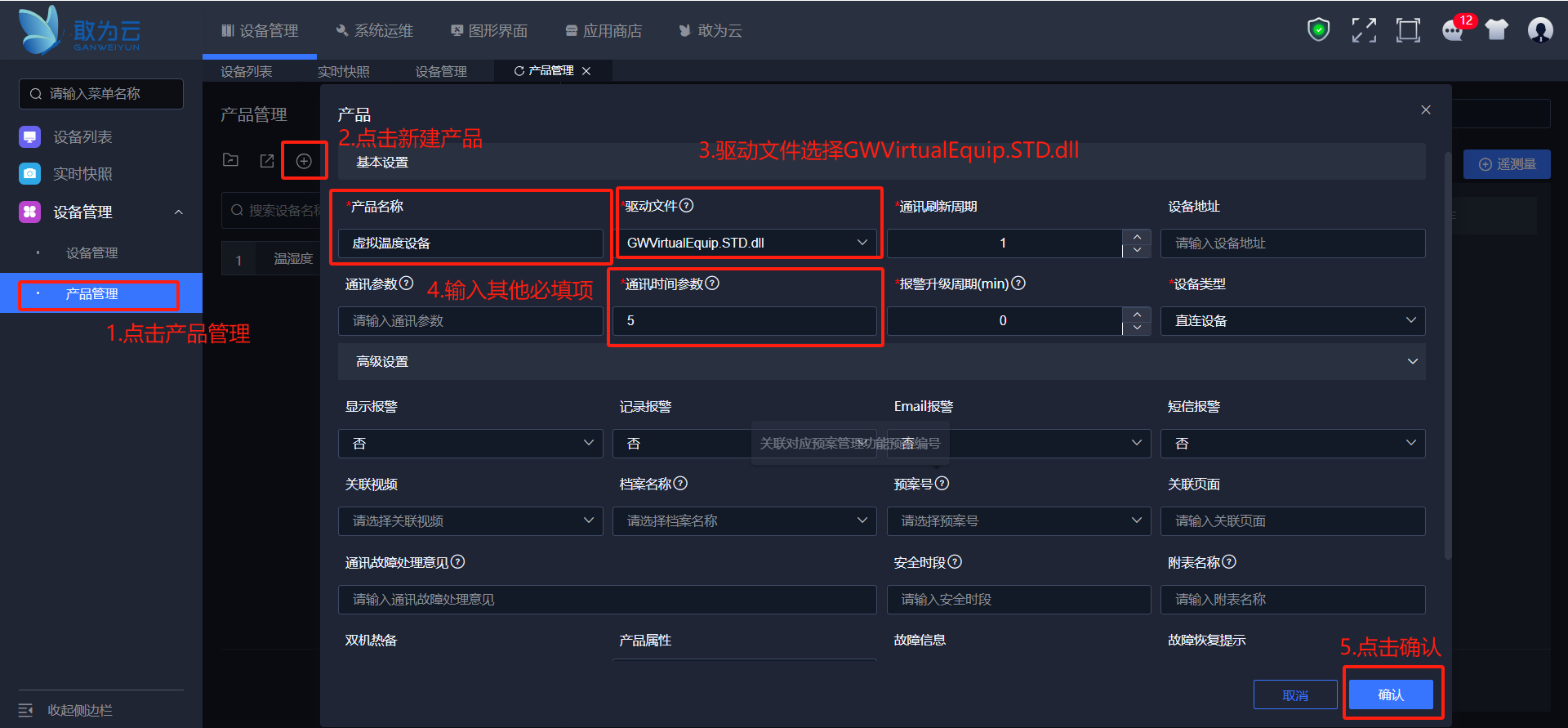 - 在设备管理页面选择产品管理,点击新增产品按钮。