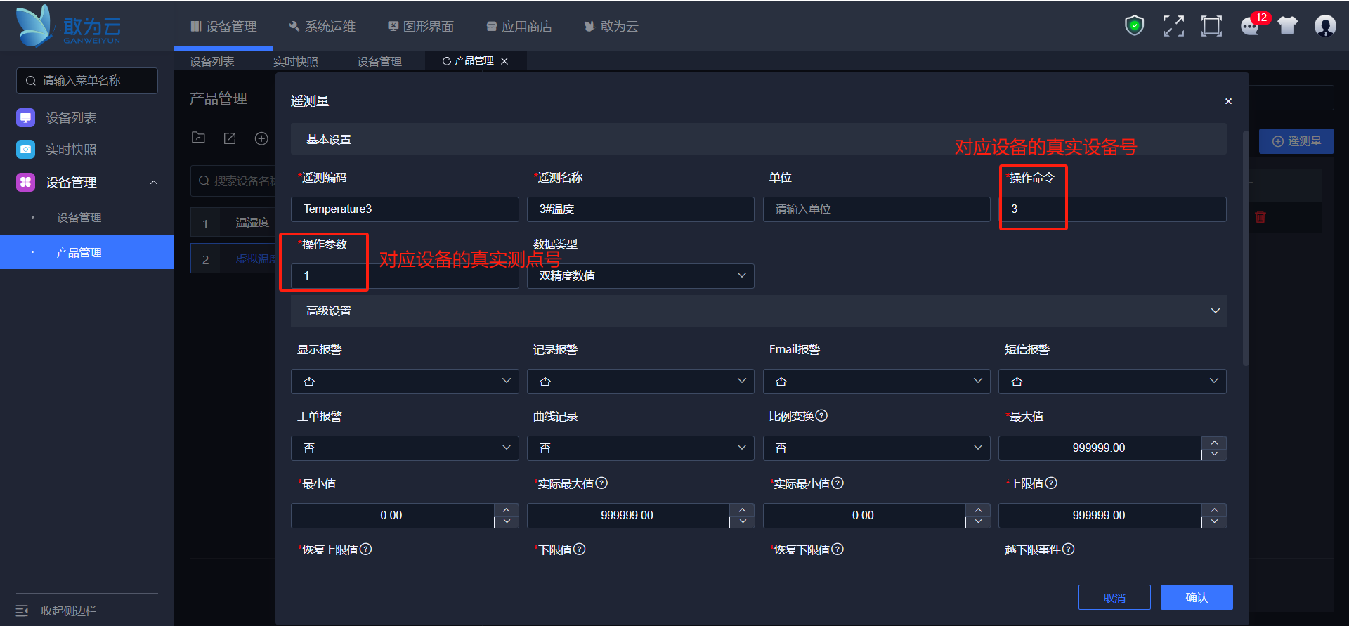 - 为刚添加的虚拟产品添加三个遥测量,遥测量的操作命令应填入对应真实设备的设备号,操作参数,应填入对应真实设备测点的测点号。