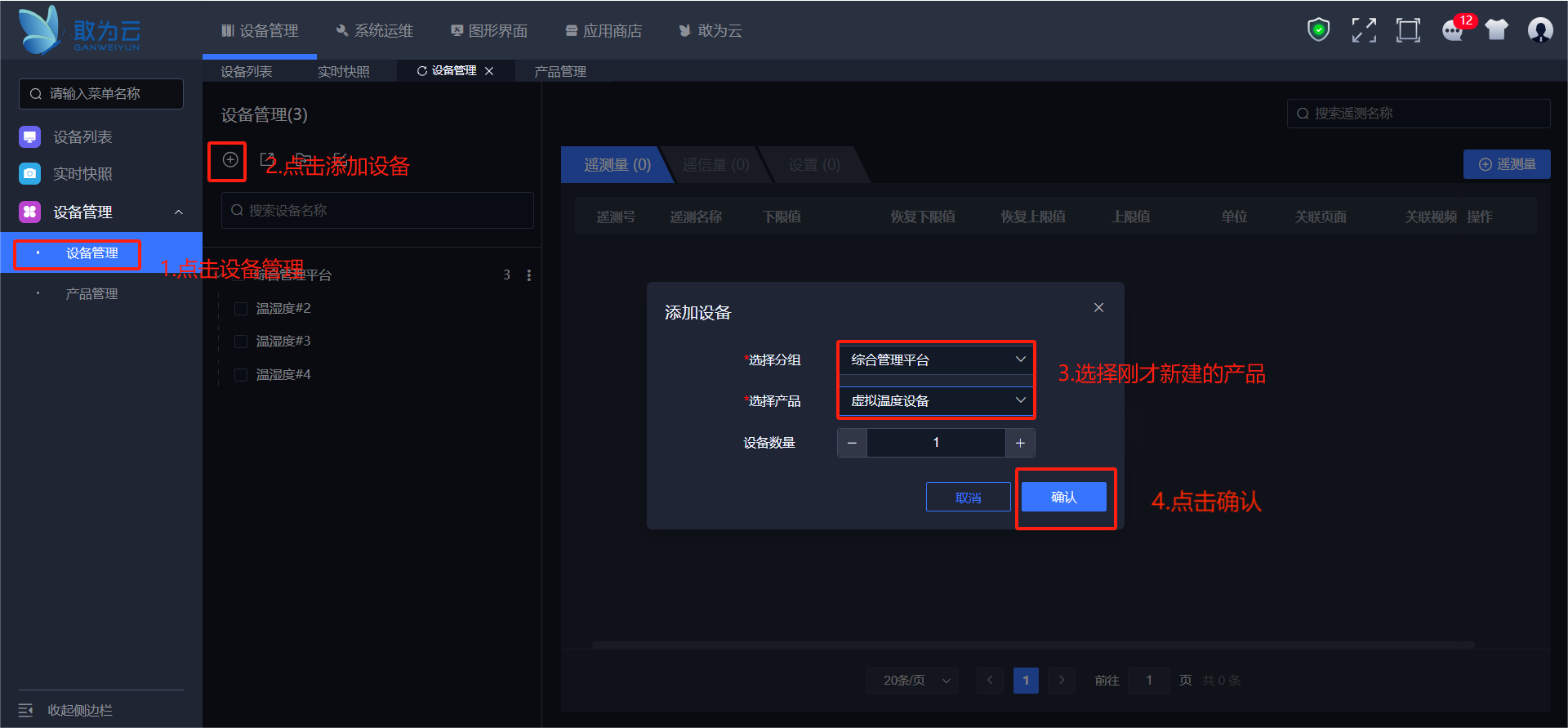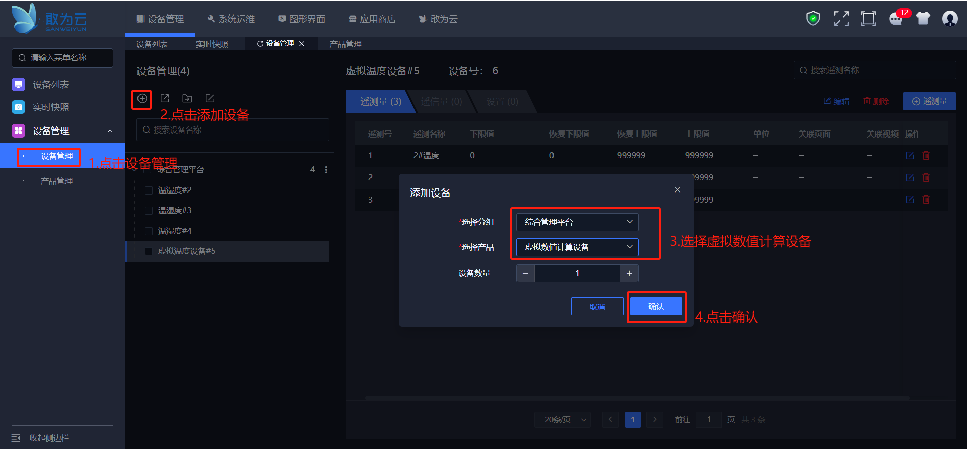 添加三个测点完成后可以在设备管理中添加一个虚拟设备