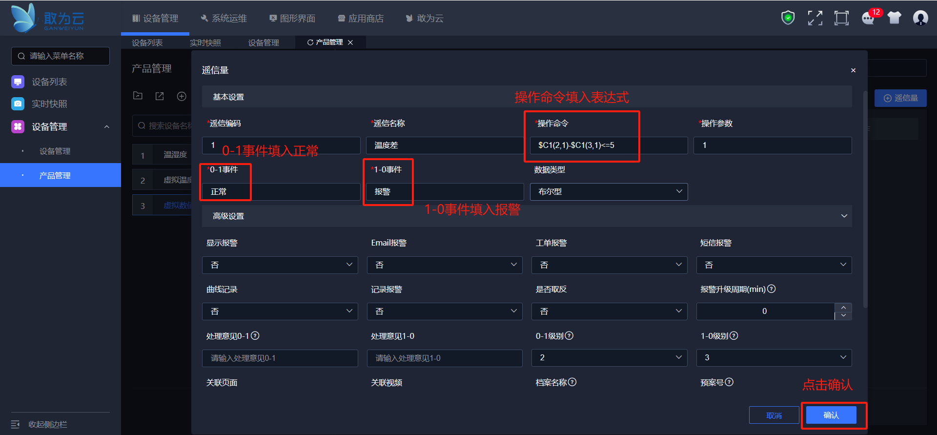 - 为刚添加的虚拟数值计算产品添加遥信量。遥信量的操作命令里填入表达式 $C1(2,1)-$C1(3,1)<=5其中 $C1(2,1) 表示2号设备的1号遥测点不带单位的数值,$C1(3,1) 表示3号设备的1号遥测点不带单位的数值。