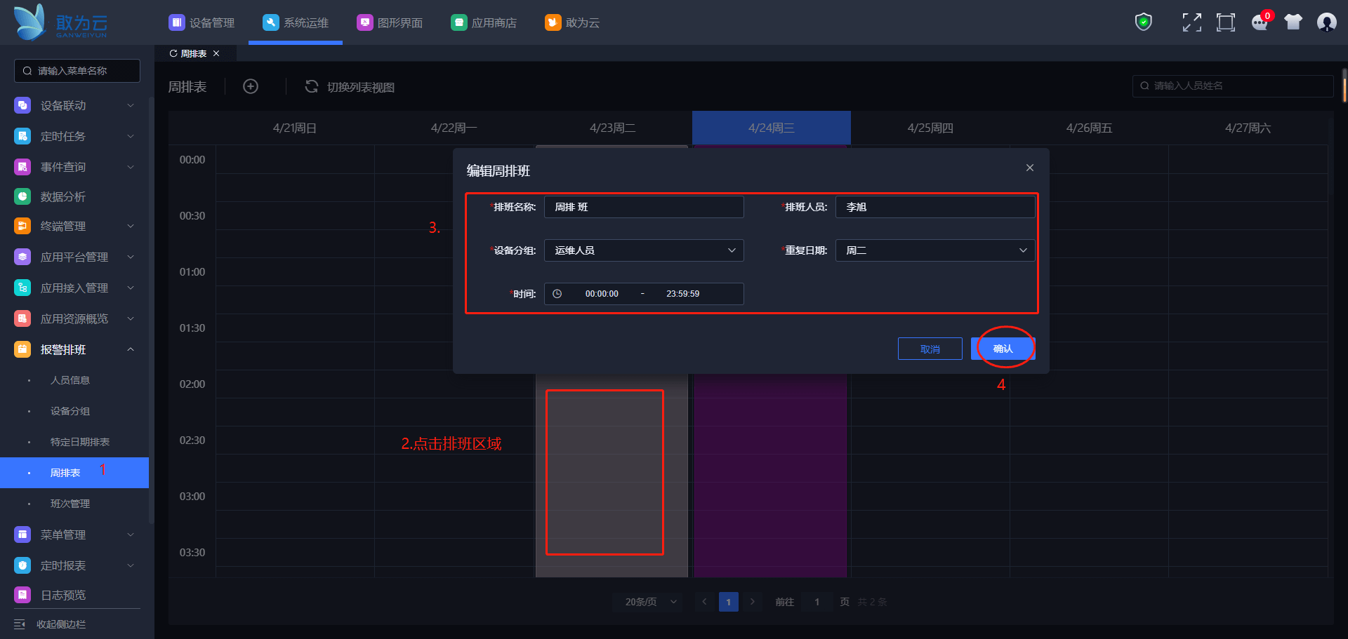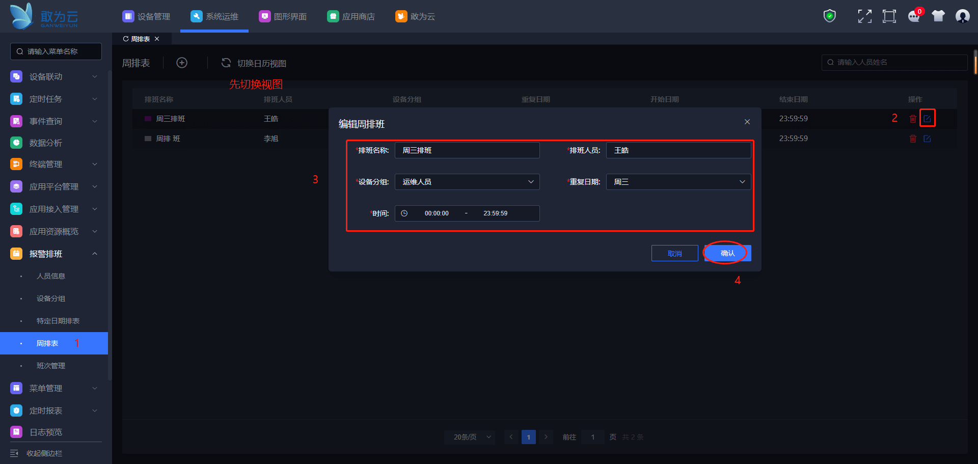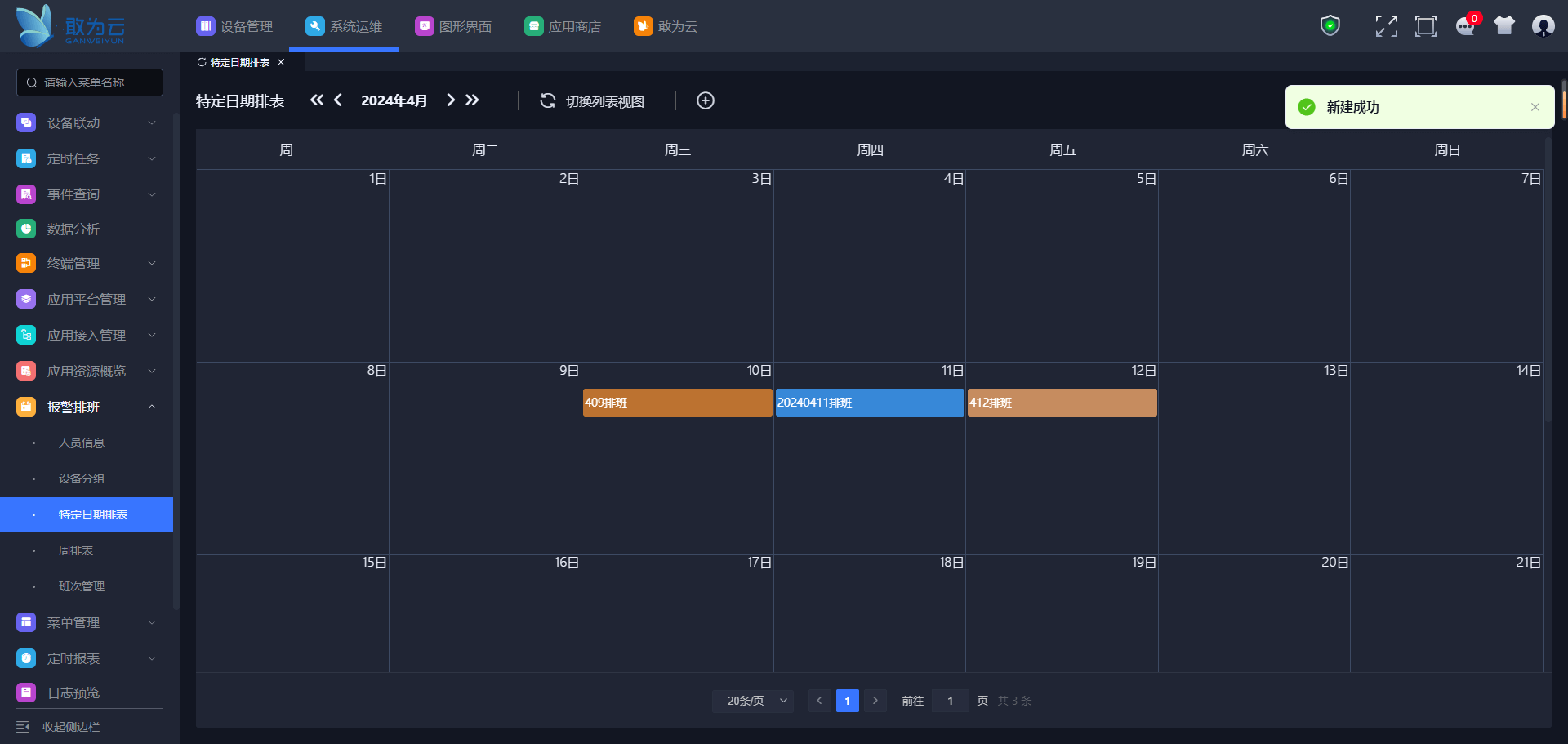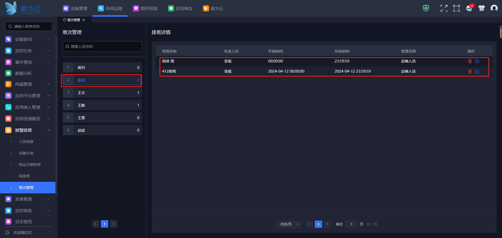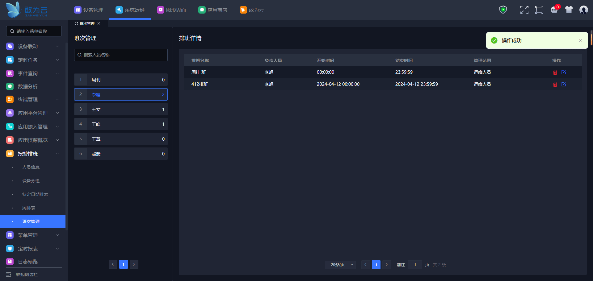 工单管理功能需要结合报警排班功能一起使用,因此先介绍报警排班功能。