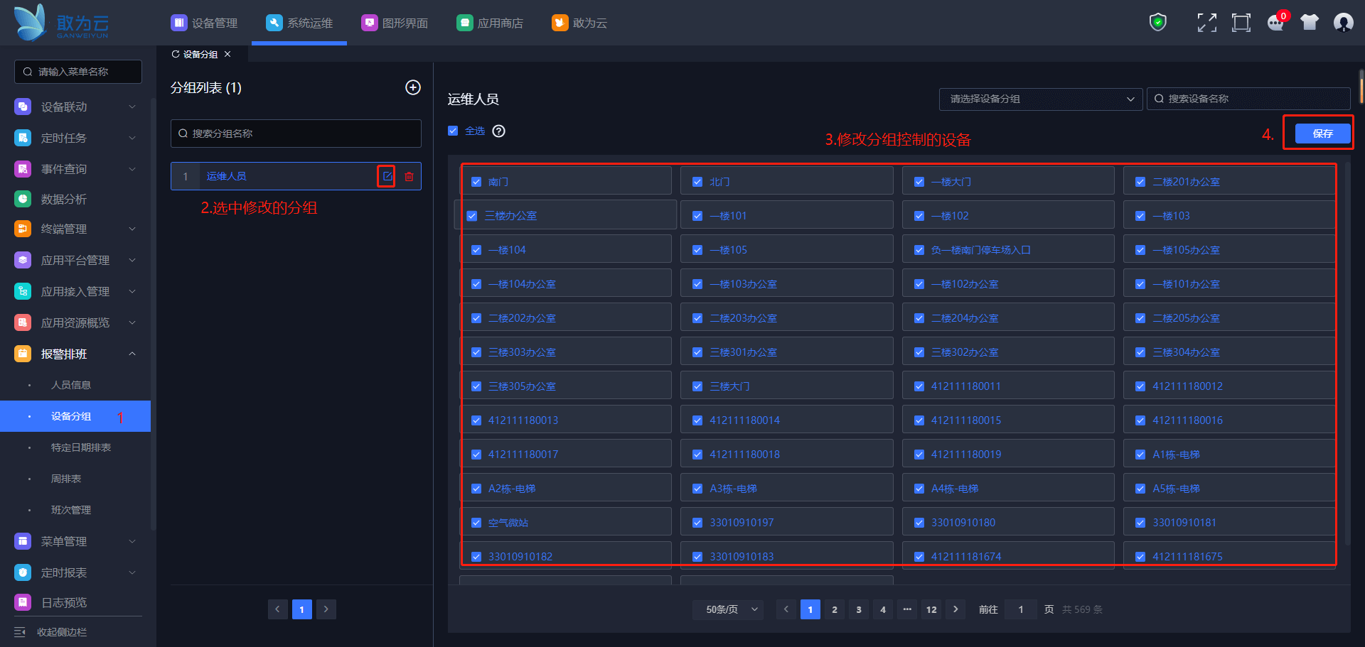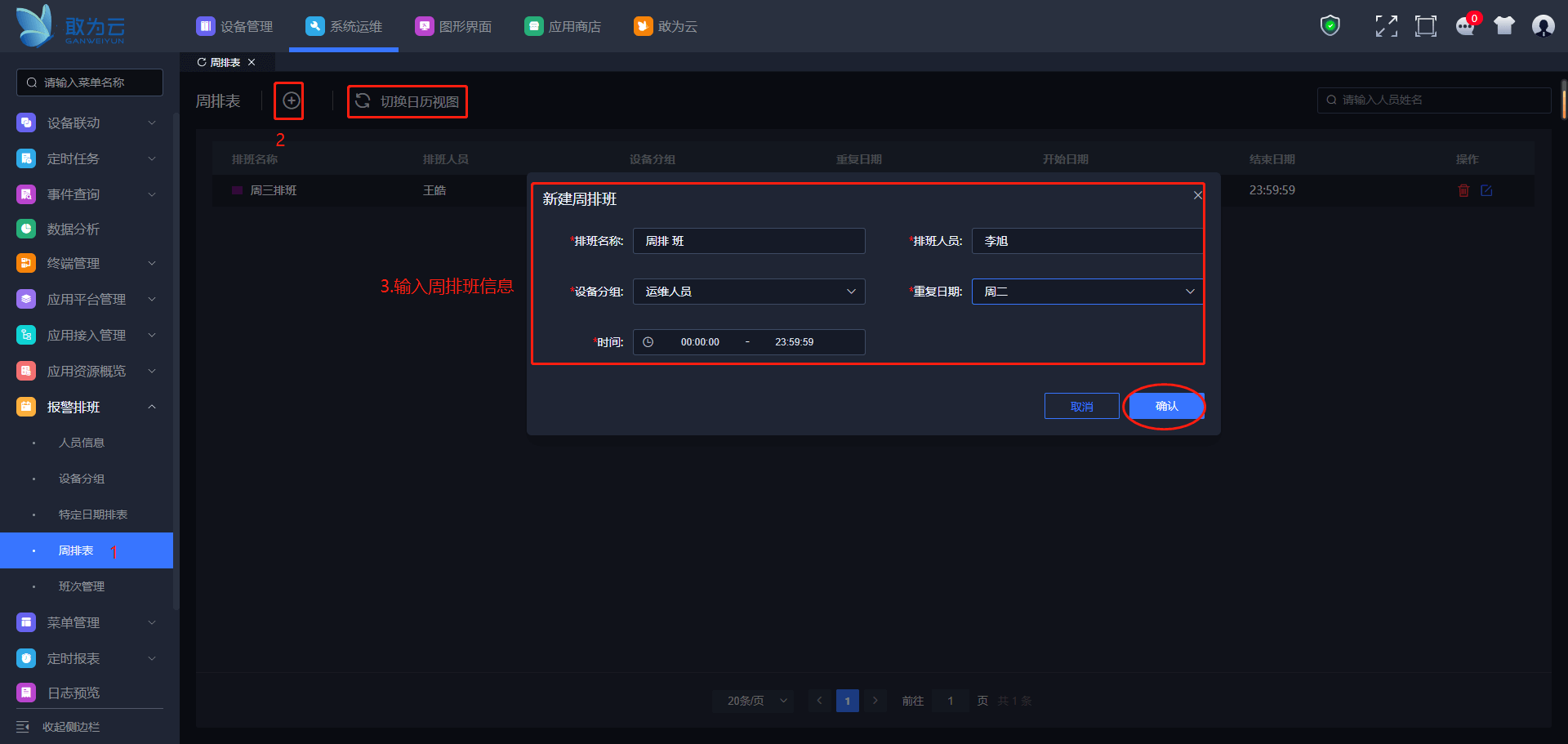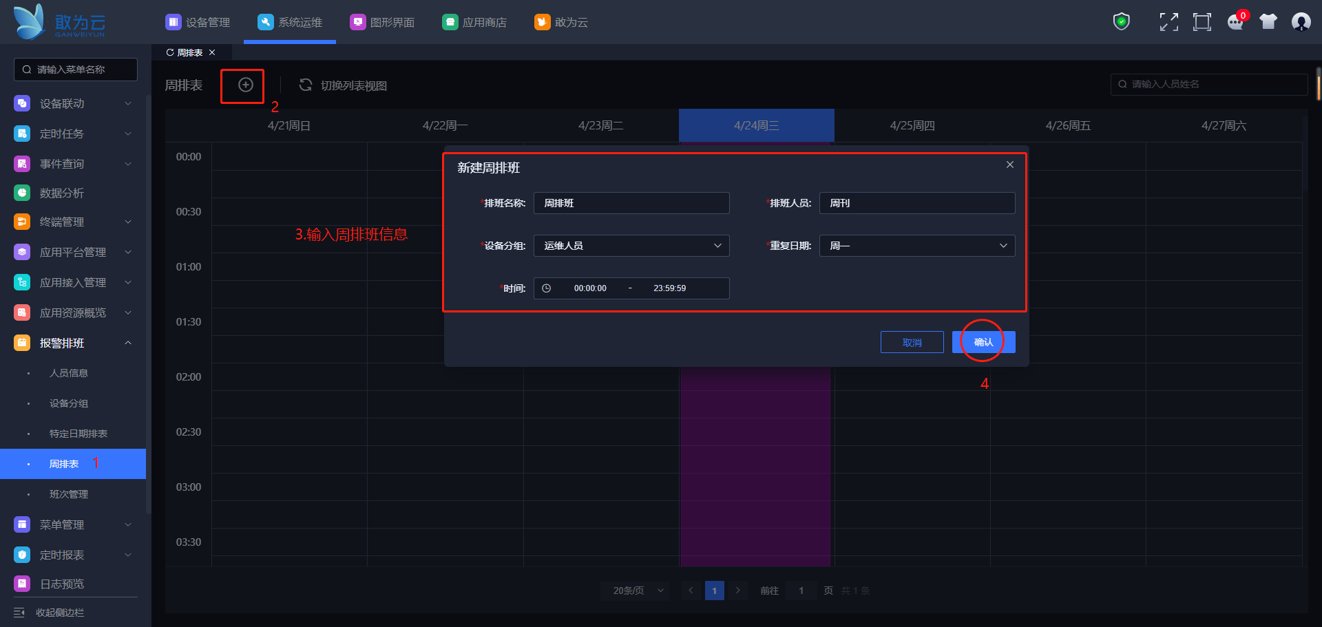 新建周排表,周排表将设备分组与值班人员联系起来,那么该值班人员就具备该组设备的管理权限。