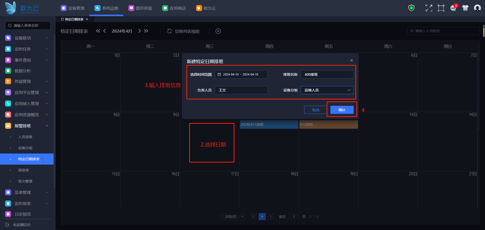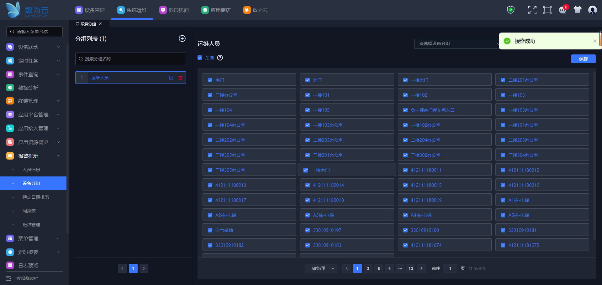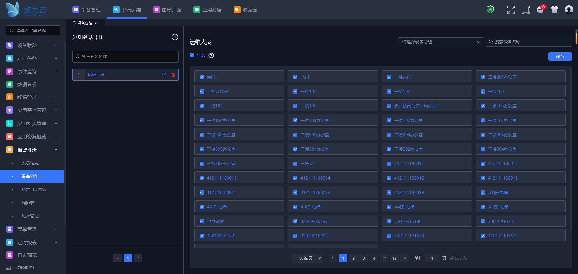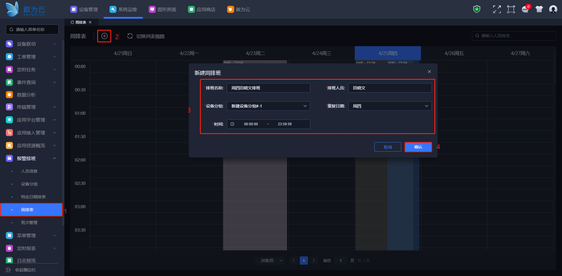 在报警排班处添加设备分组和人员信息,并配置排表信息,当天设备告警生成的工单就会自动分配给对应值班人员。