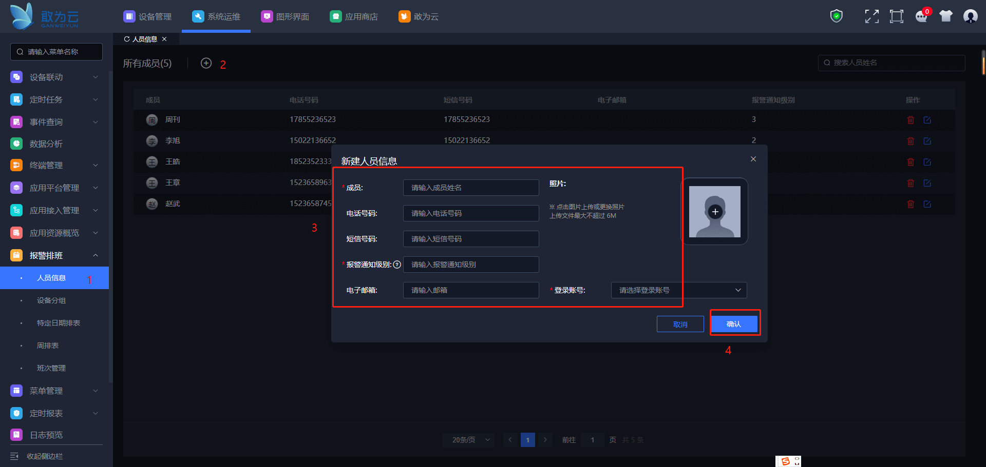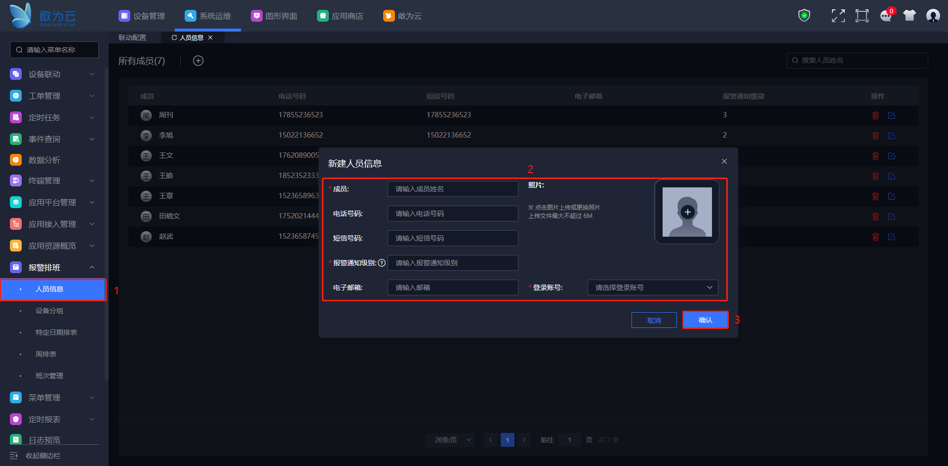 所有负责人员的信息都必须添加到此列表中才能实现当设备报警时给负责人员发送报警信息的功能。