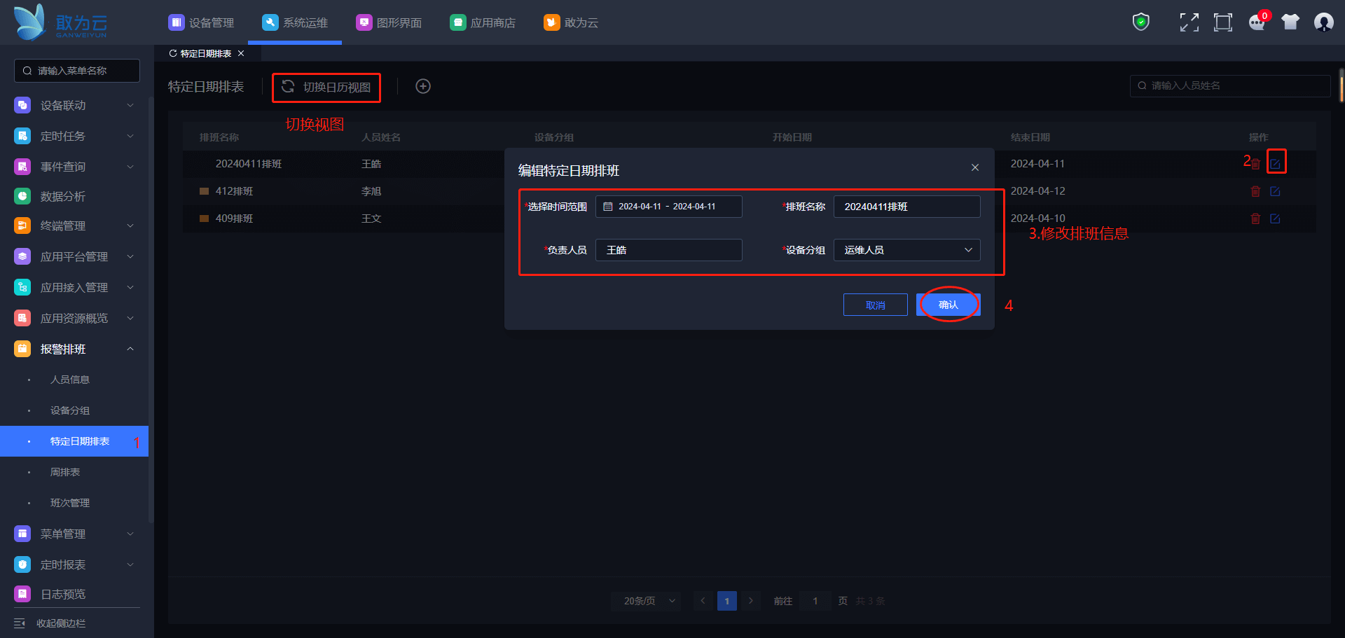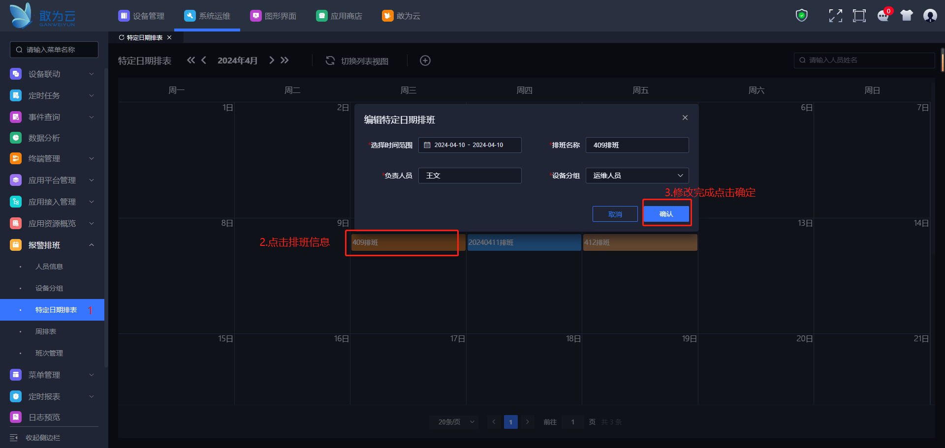 | 3 | 支持编辑特定日期排班 | 支持编辑已有的排班任务进行重新安排。 |