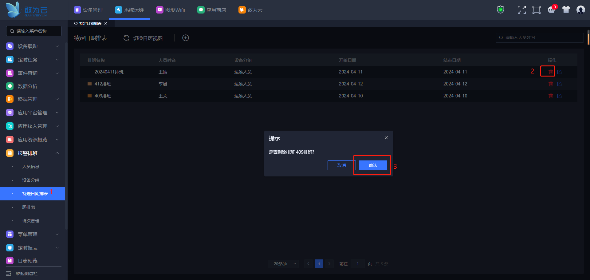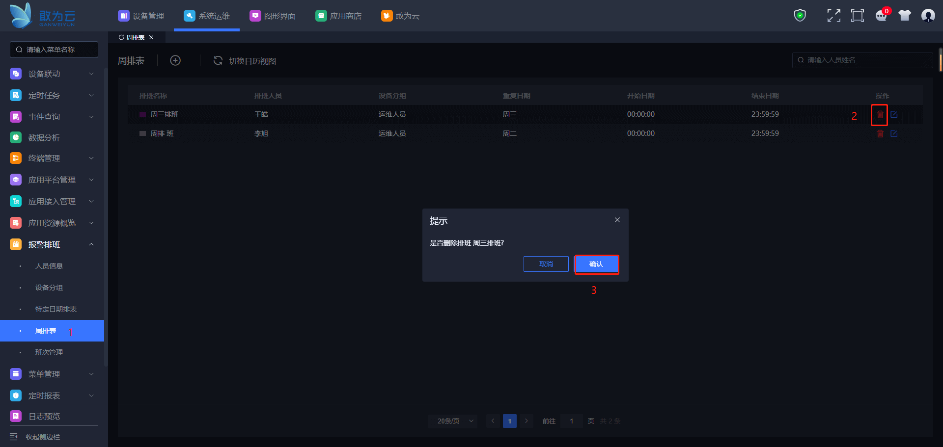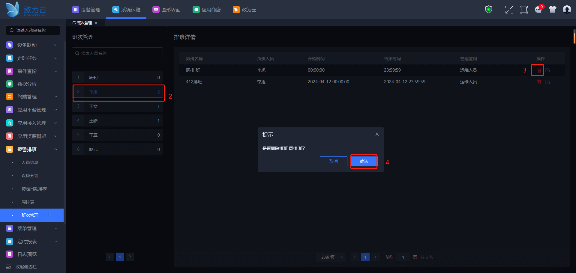 在弹窗中点击确认按钮。确定删除后,列表不展示该排班。