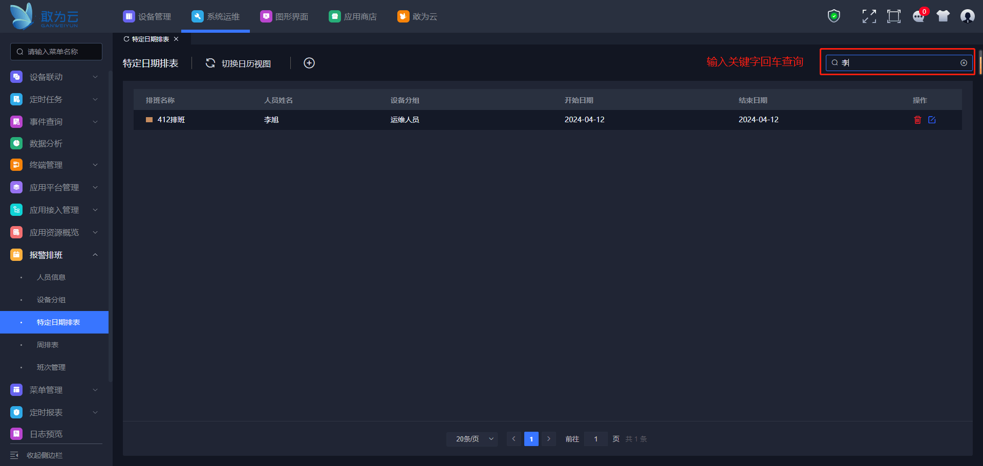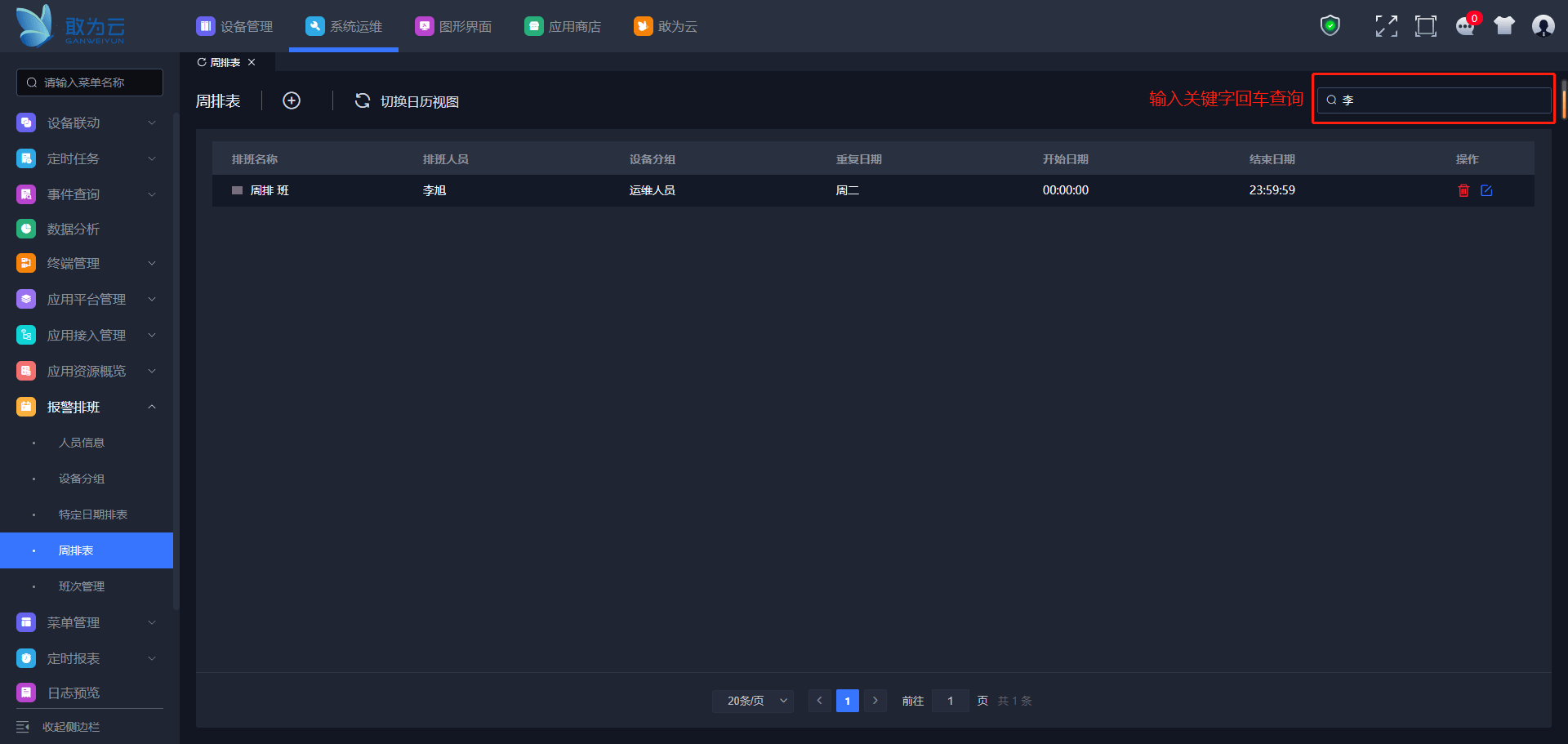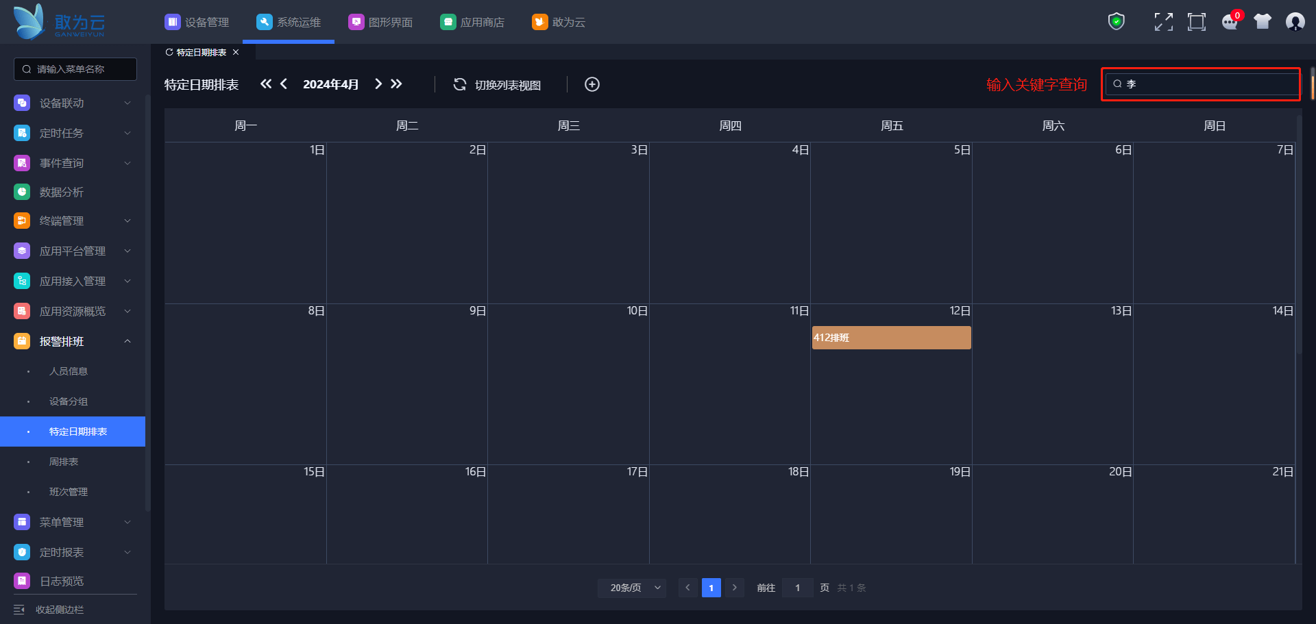 右侧输入框输入人名关键字查询出包含关键字的排班信息。