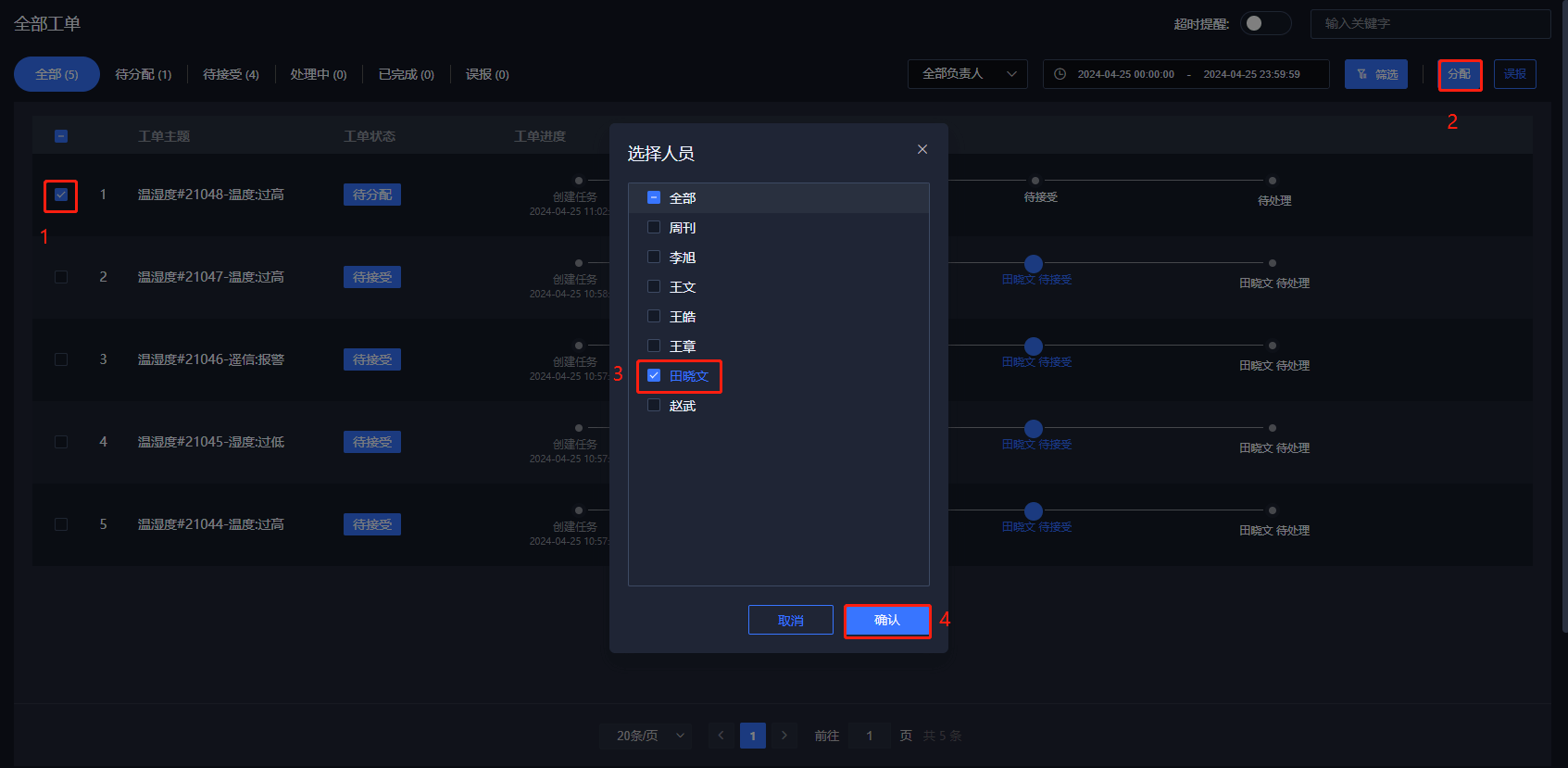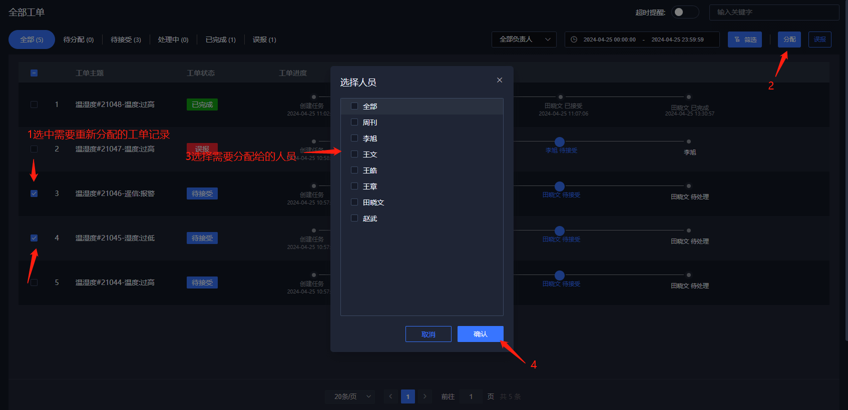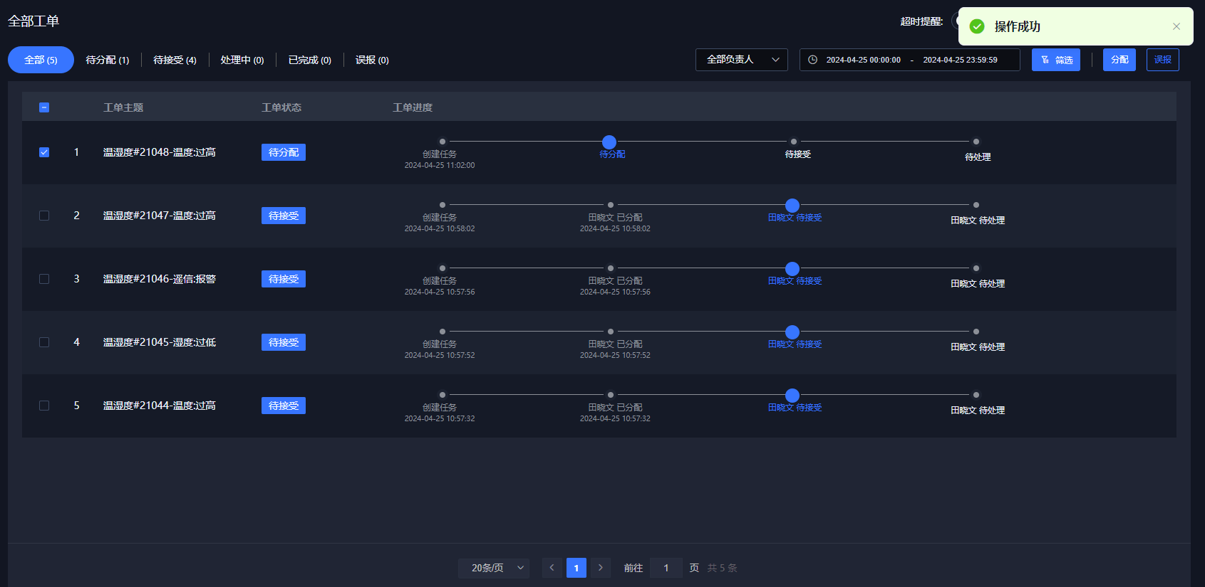 目前处于待分配状态,选择人员并分配工单。分配完成后工单显示待接受状态。(分配的人员需是在报警排班中安排的值班人员,否则该人员不能接受工单。后续操作中有时操作完后需要等待一小会让系统刷新状态)