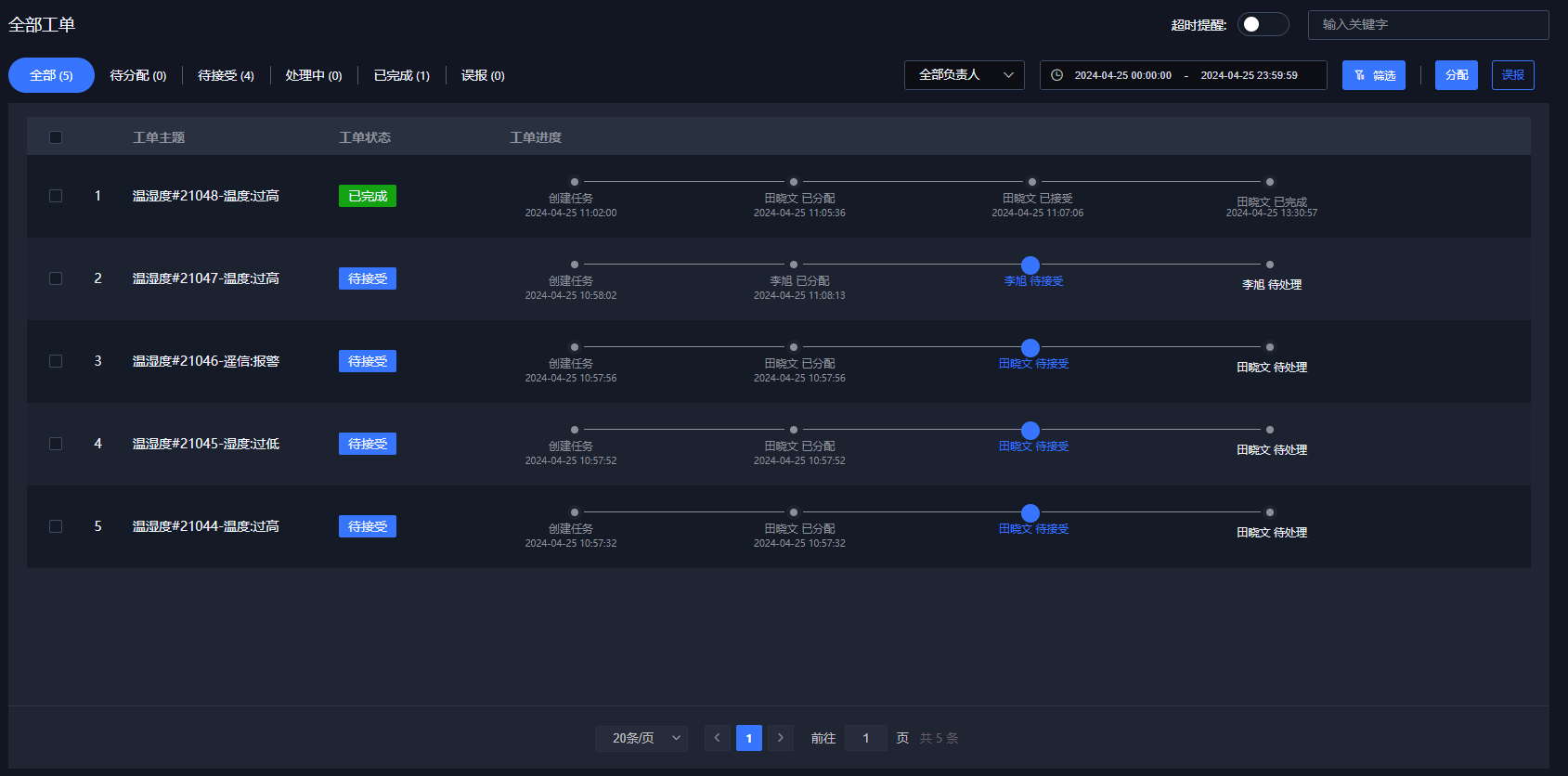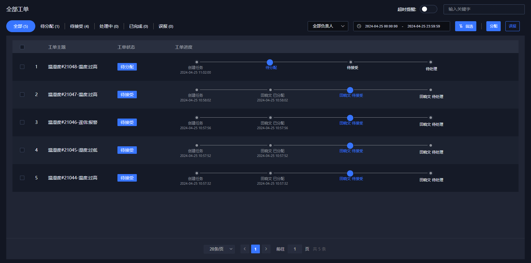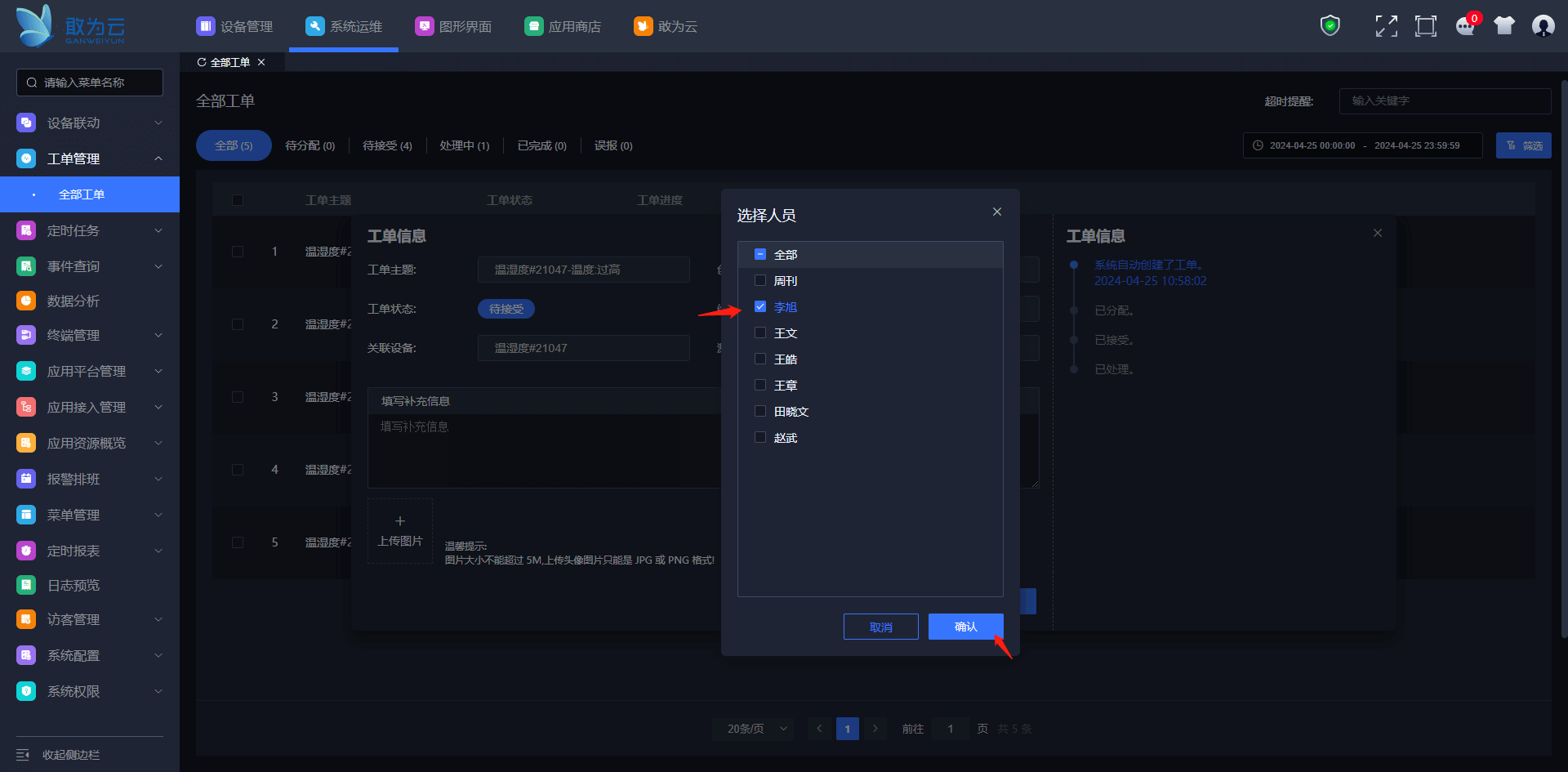 目前处于待分配状态,选择人员并分配工单。分配完成后工单显示待接受状态。(分配的人员需是在报警排班中安排的值班人员,否则该人员不能接受工单。后续操作中有时操作完后需要等待一小会让系统刷新状态)