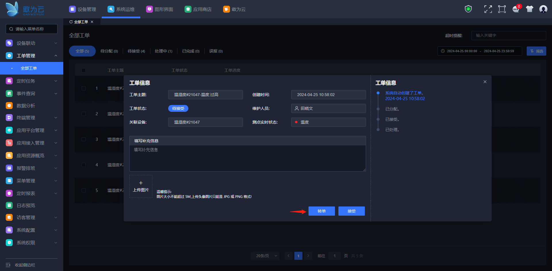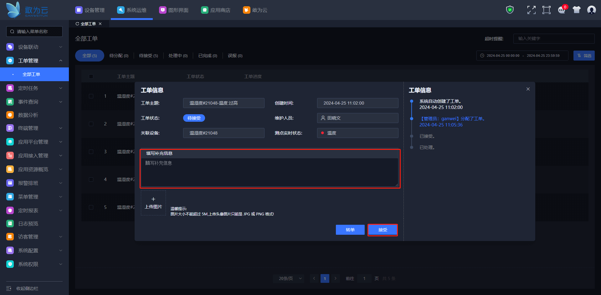 - 双击区域,打开工单信息,然后点击接受,最后查看工单状态。