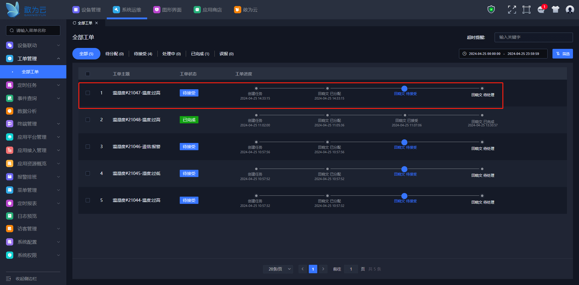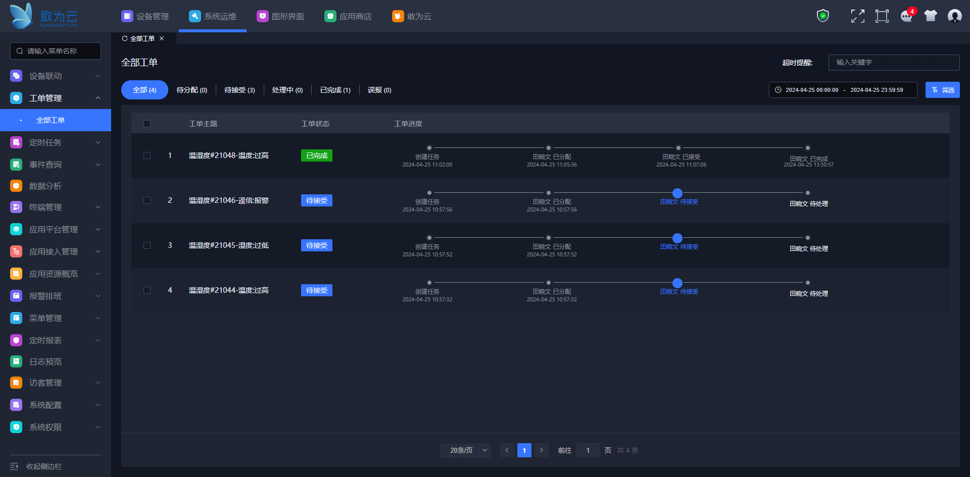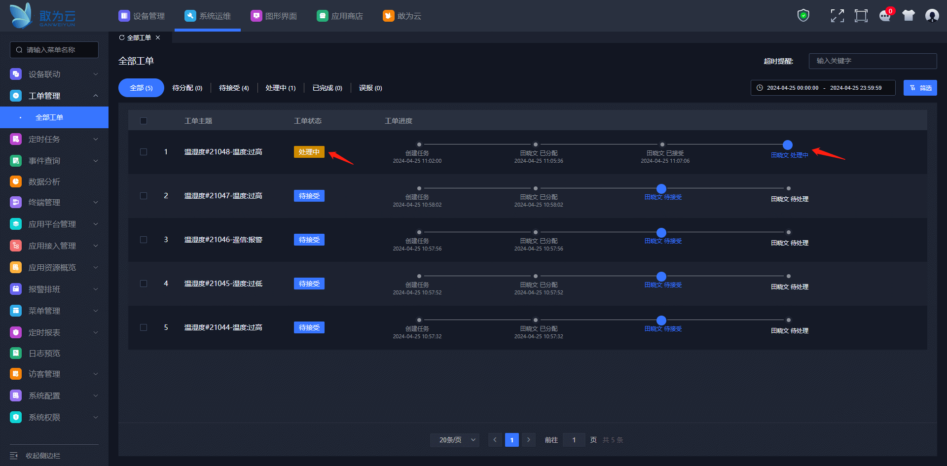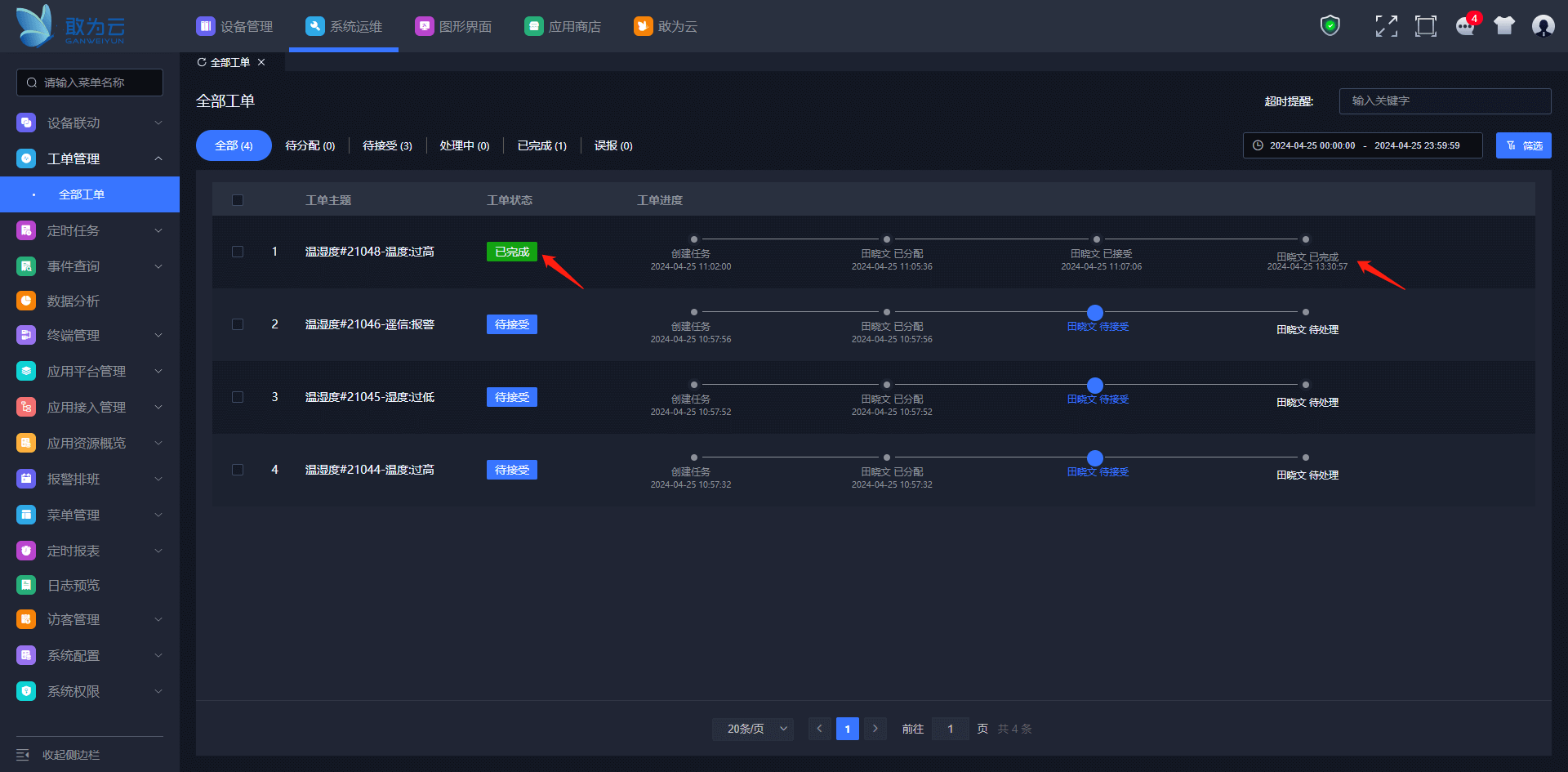 查看工单信息状态(设备在初始化时必须在工单报警中选择“是”,且设备出现了警告,才会在工单管理中显示。简略操作流程看本节末尾“工单生成流程详解”)。