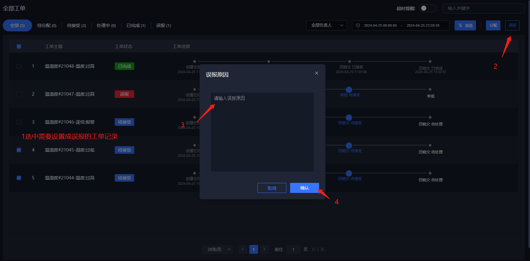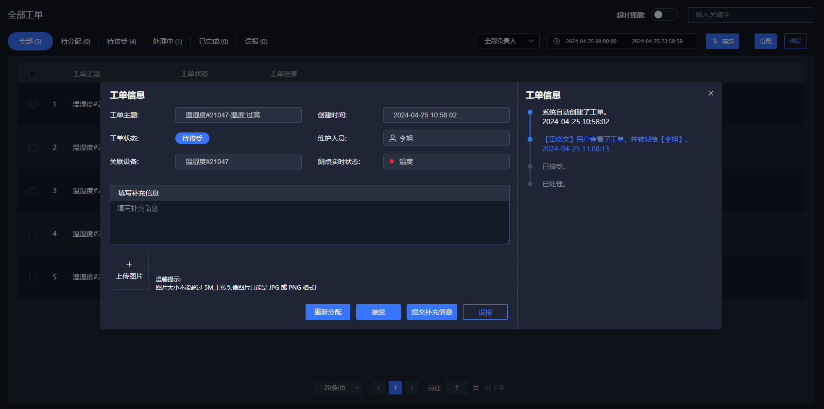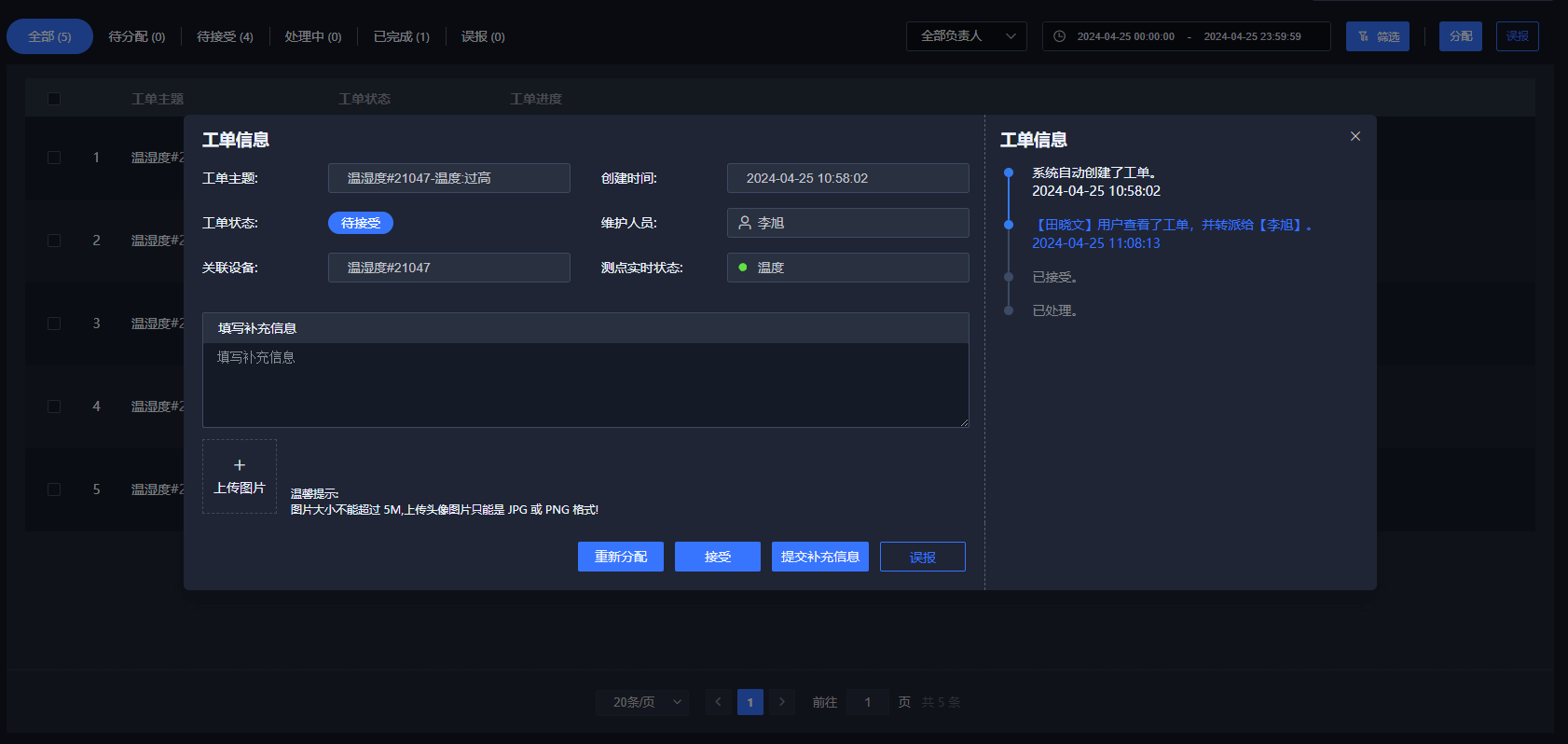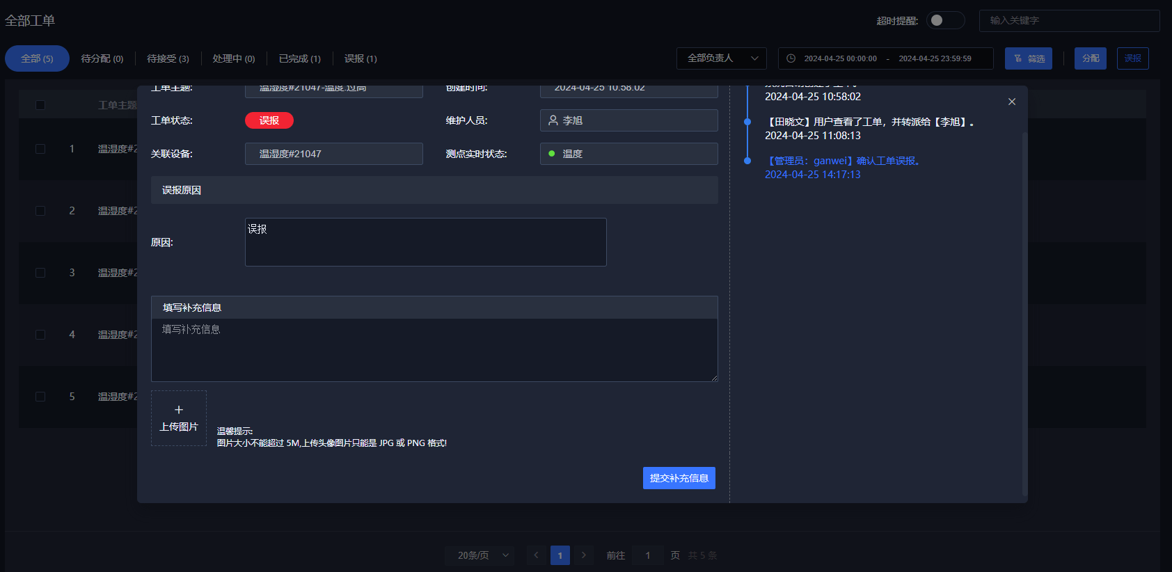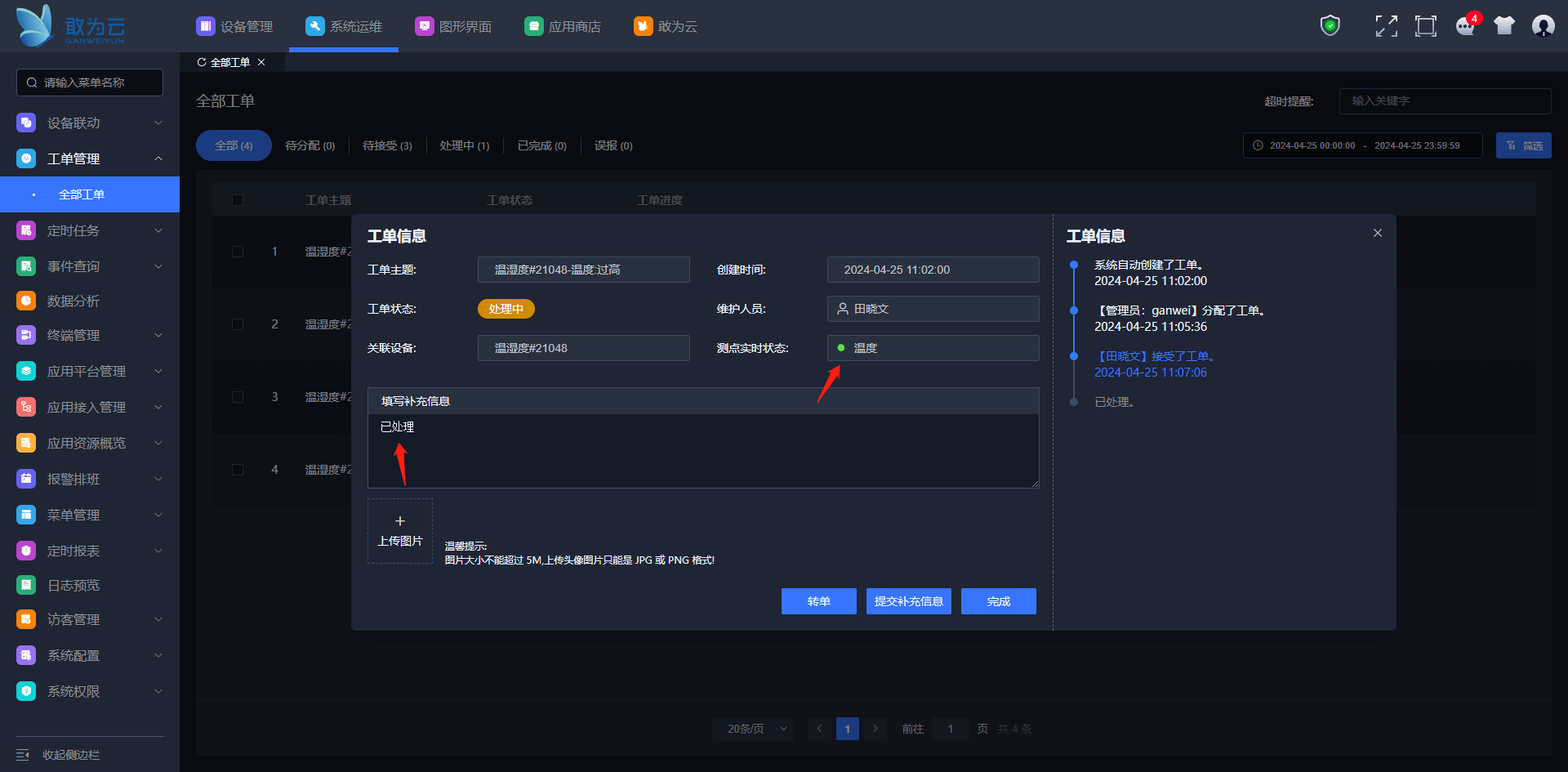 仍在处理中的工单,可以分配给其他具备该设备权限的值班人员,也可以填写补充信息。也可以误报结束工单,可以查看工单记录。