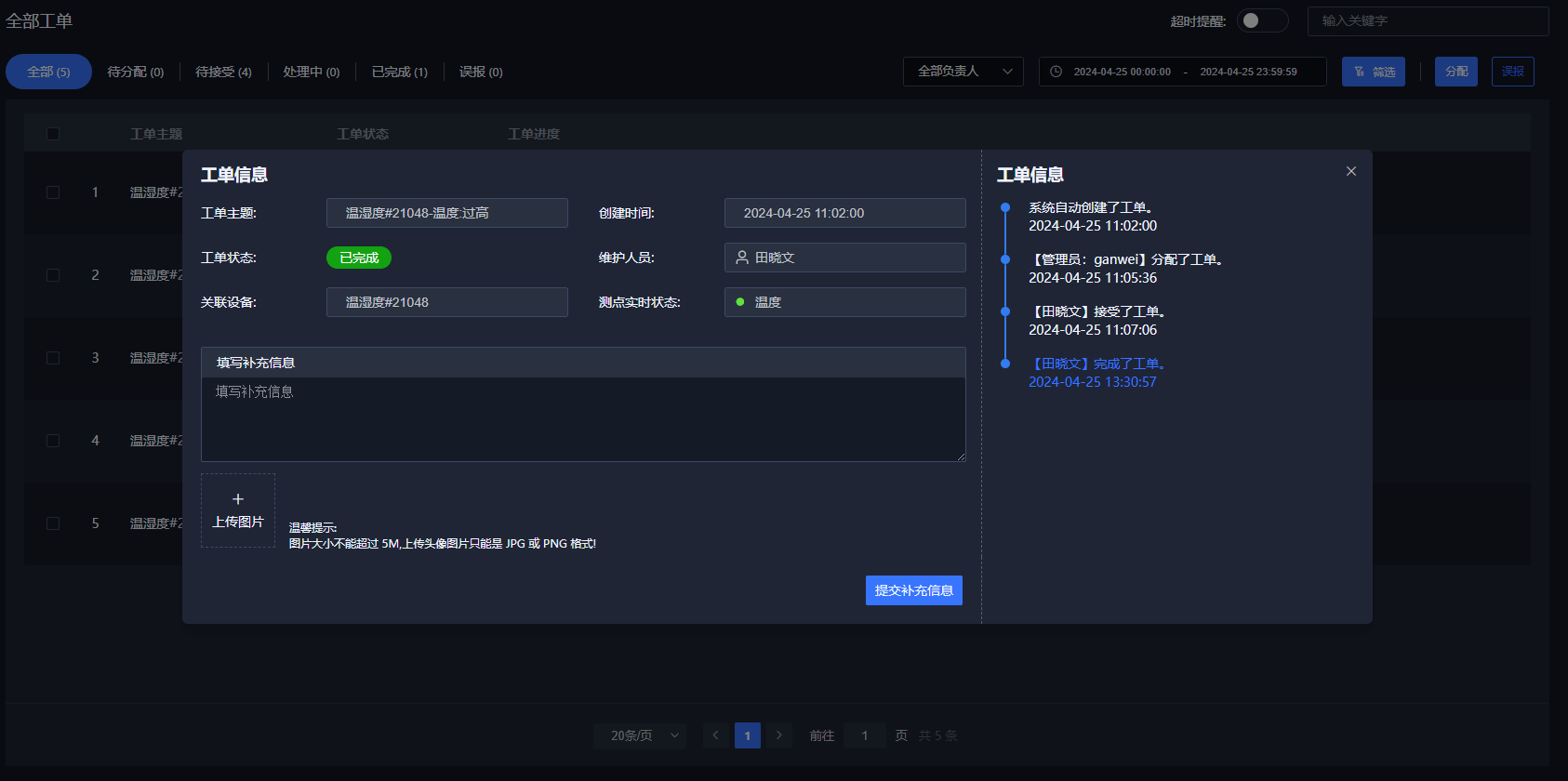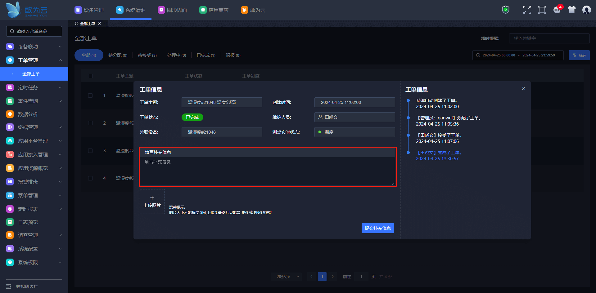 - 完成的工单可以填写补充信息,可以查看工单记录