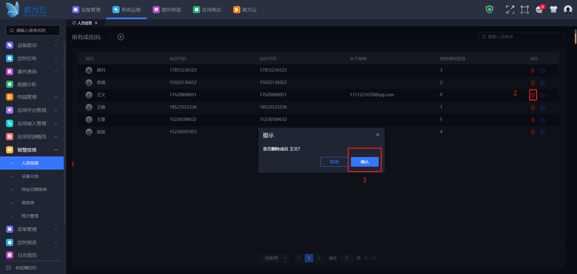 在弹窗中点击确认按钮,删除后,列表不显示该人员信息。