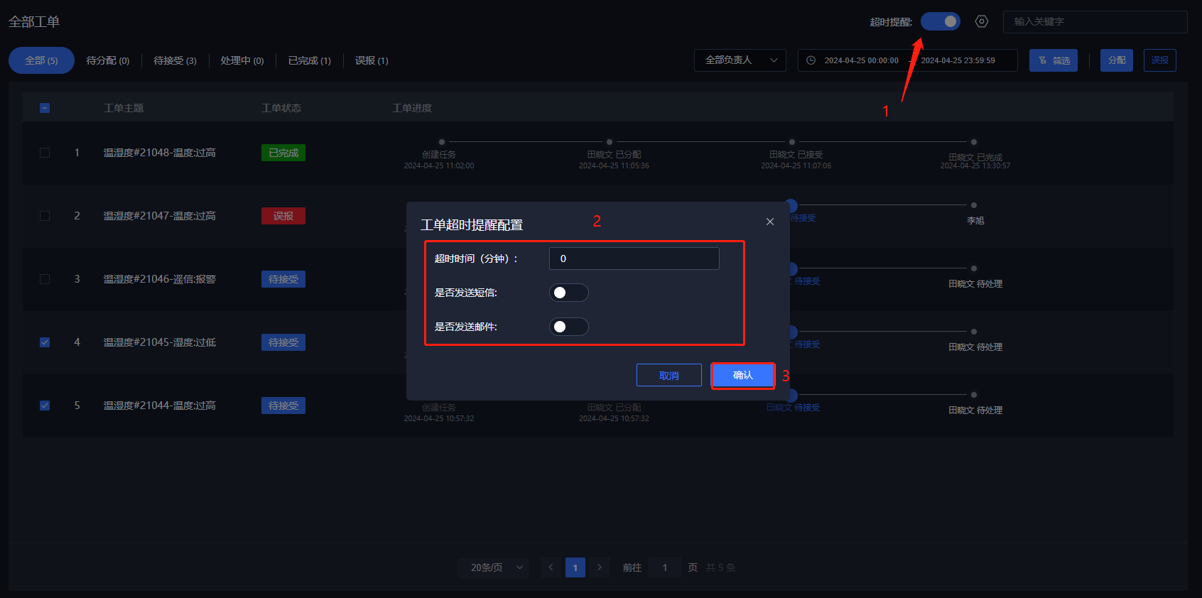 点击超时提醒开关。自动跳出工单超时提醒配置,填写超时时间,选择是否发送短信,是否发送邮件。