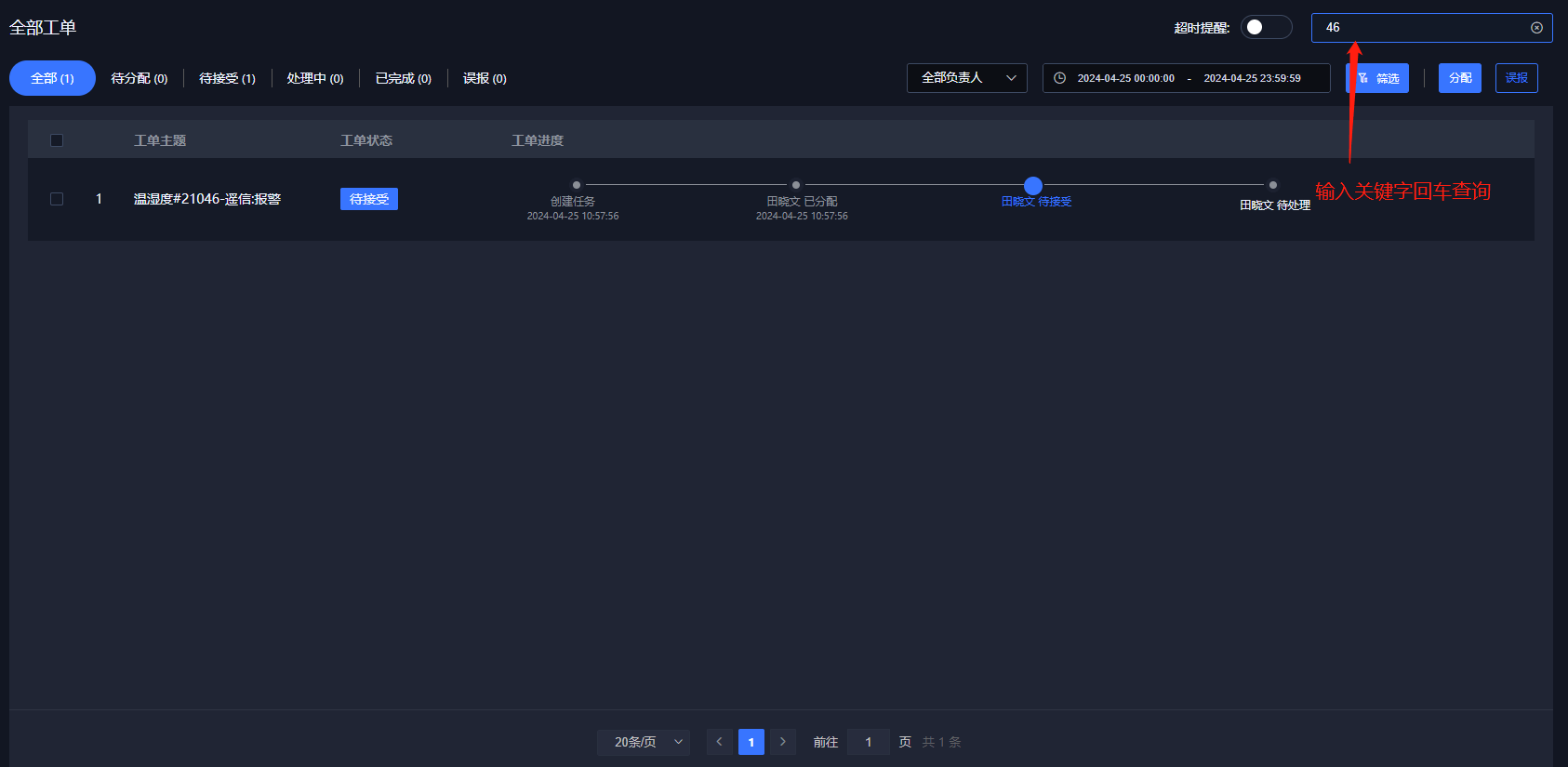 选择工单状态,输入工单关键字,选择查询负责人,输入查询时间段。搜索出相应工单信息。