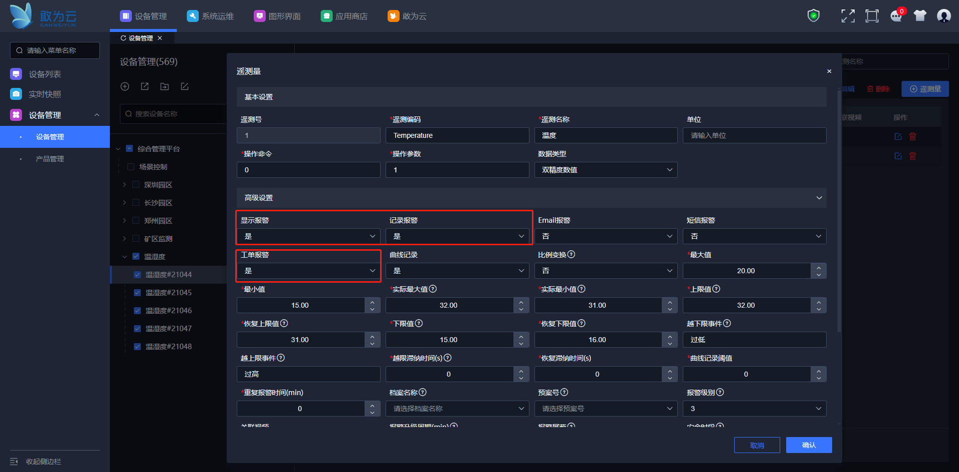 在设备管理页面配置测点“是否生成工单”,编辑设备测点,如下图: