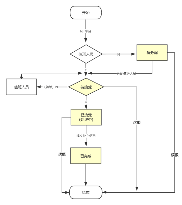 当设备的测点越限后,如果设置了工单报警,则会将工单派发给对应的人员。工单管理是对工单的全程跟踪信息。工单状态分为待分配、待接受、待处理、已完成、误报。管理员可以分配工单,值班人员可以接受工单、完成工单、转单、提交补充信息。流程如下: