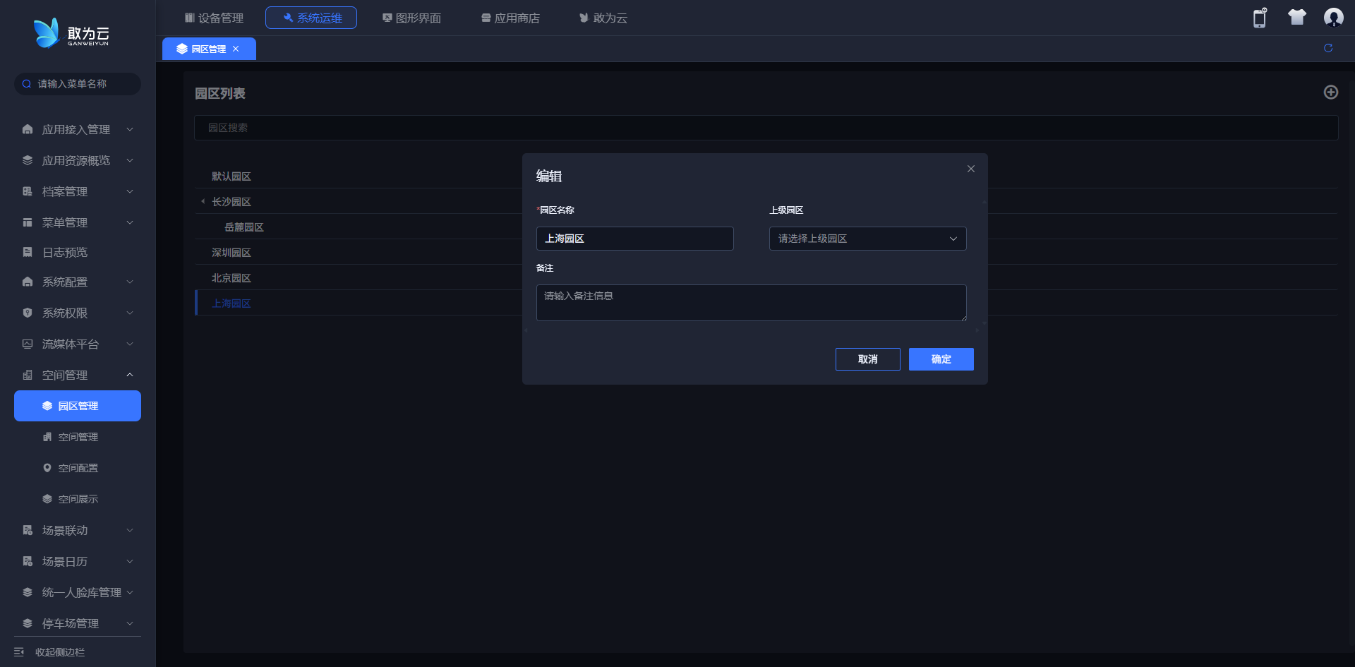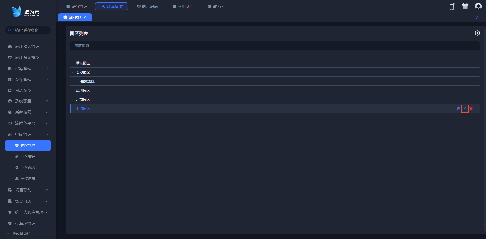 在园区列表中点击编辑按钮,修改完后点击确定即可。