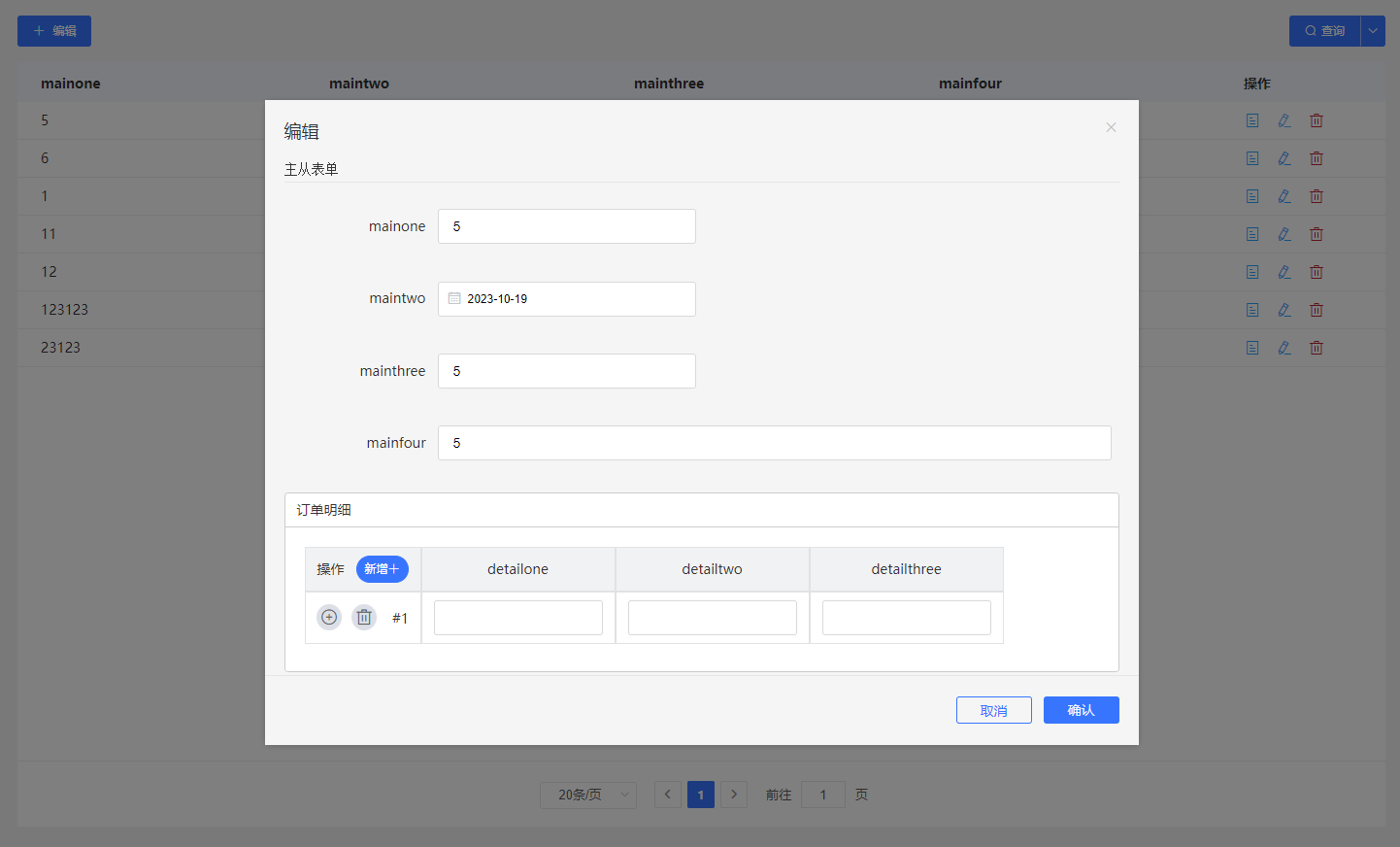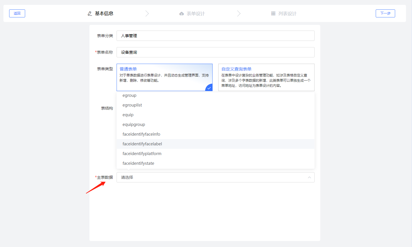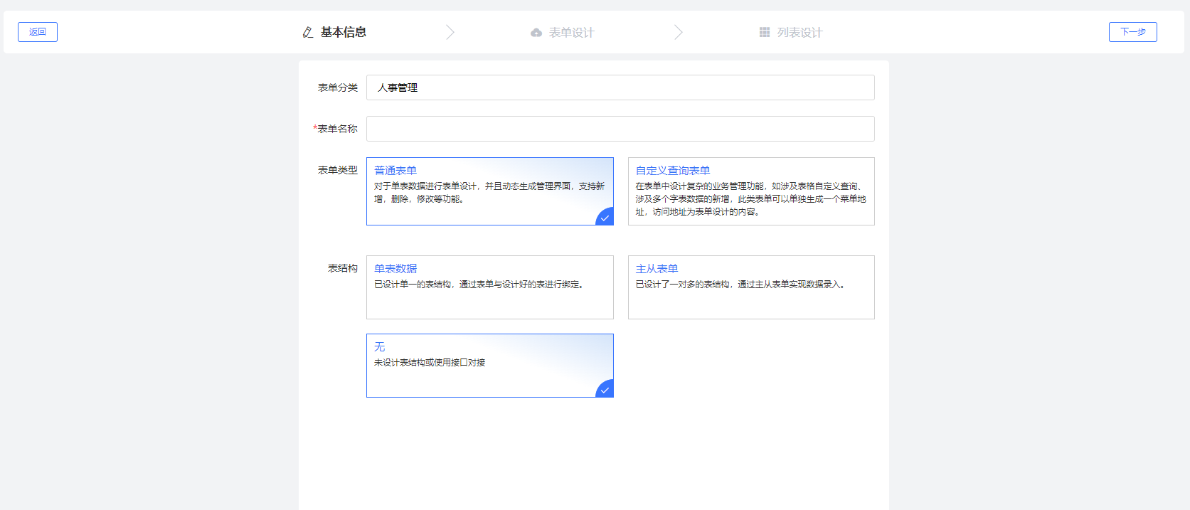 单表数据:绑定单个数据表,需对数据表字段和表单进行绑定。 主从表单:绑定一对多关系的数据表,可选多个从表,需对数据表字段和表单进行绑定。