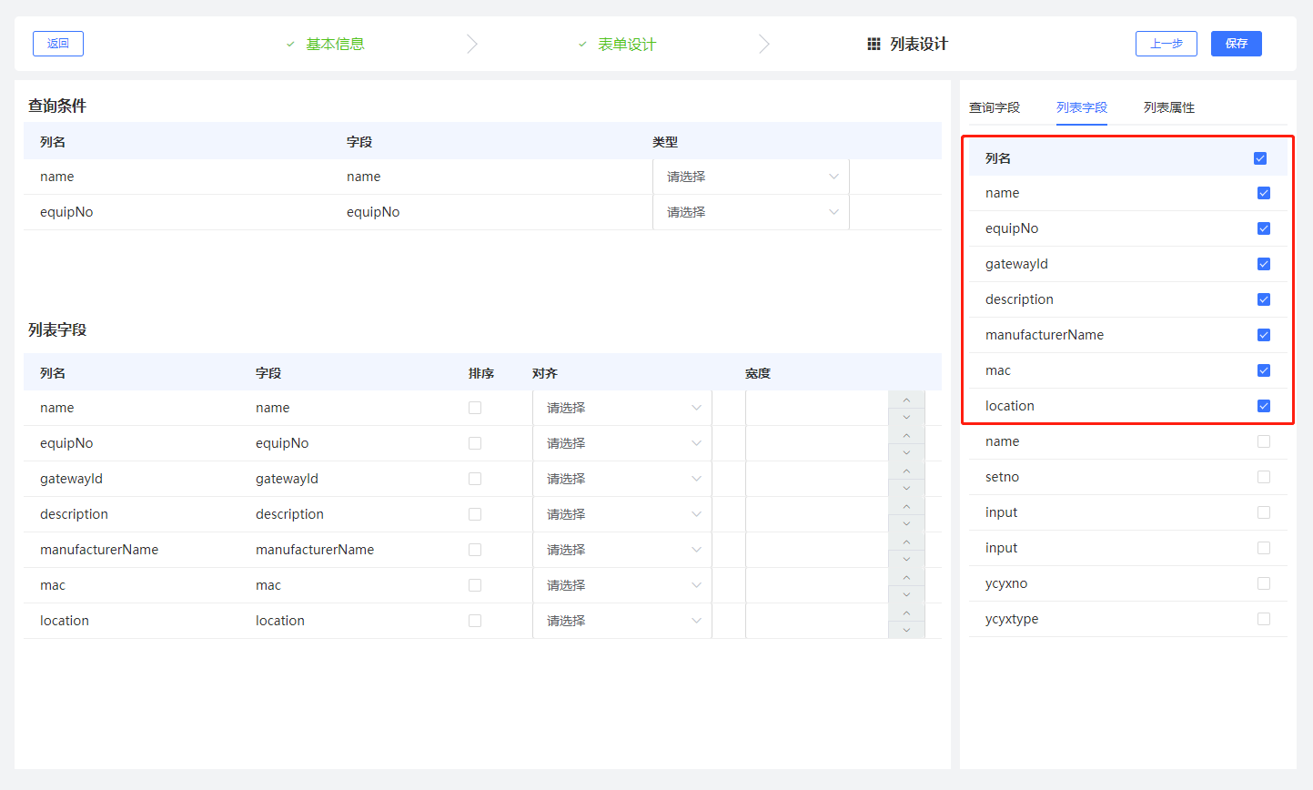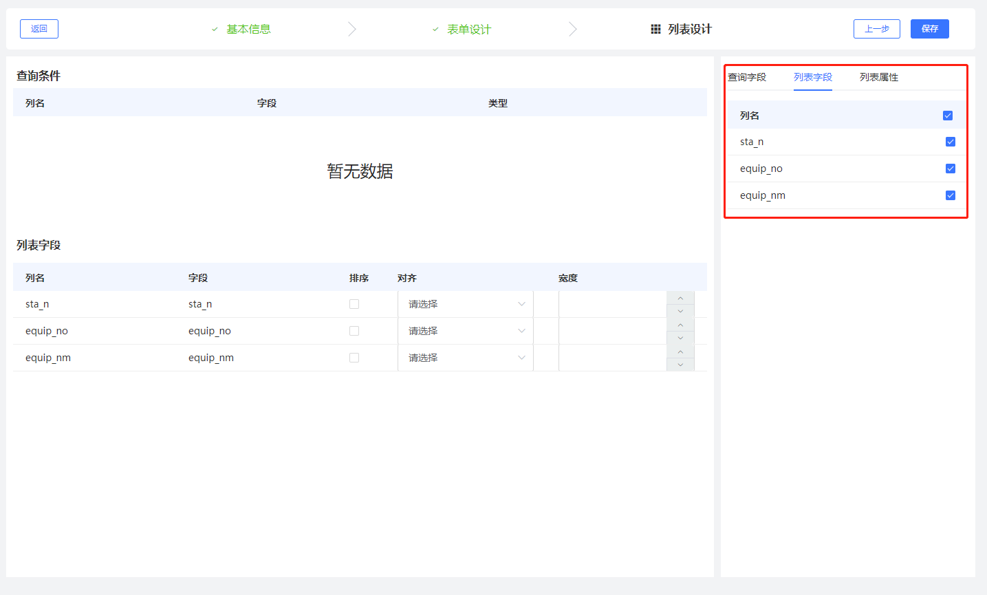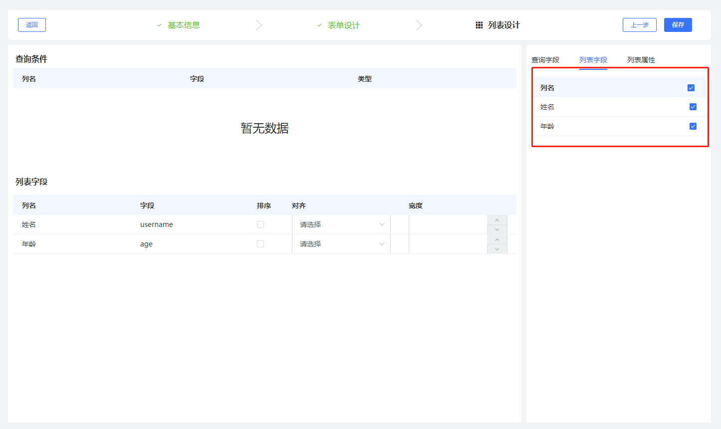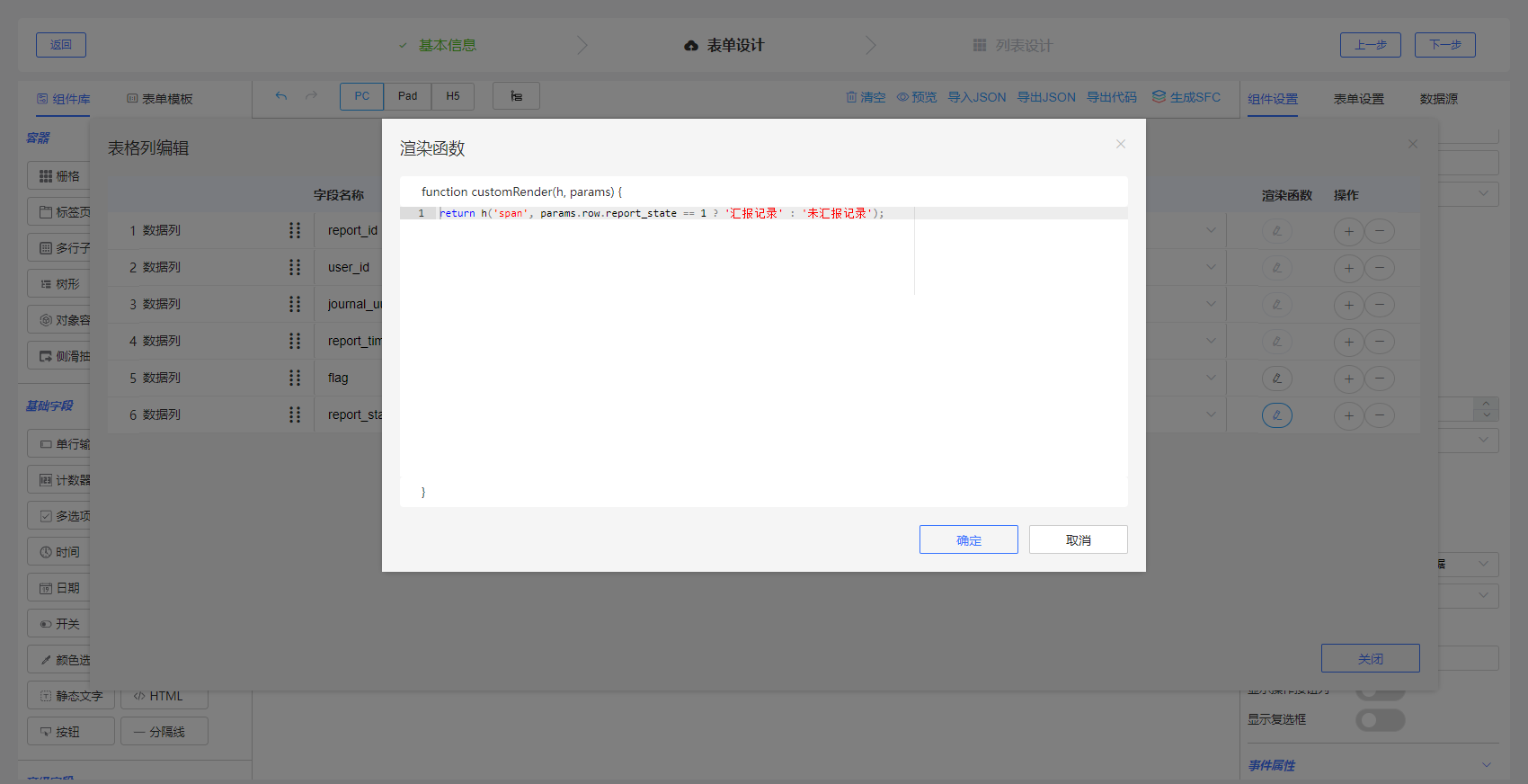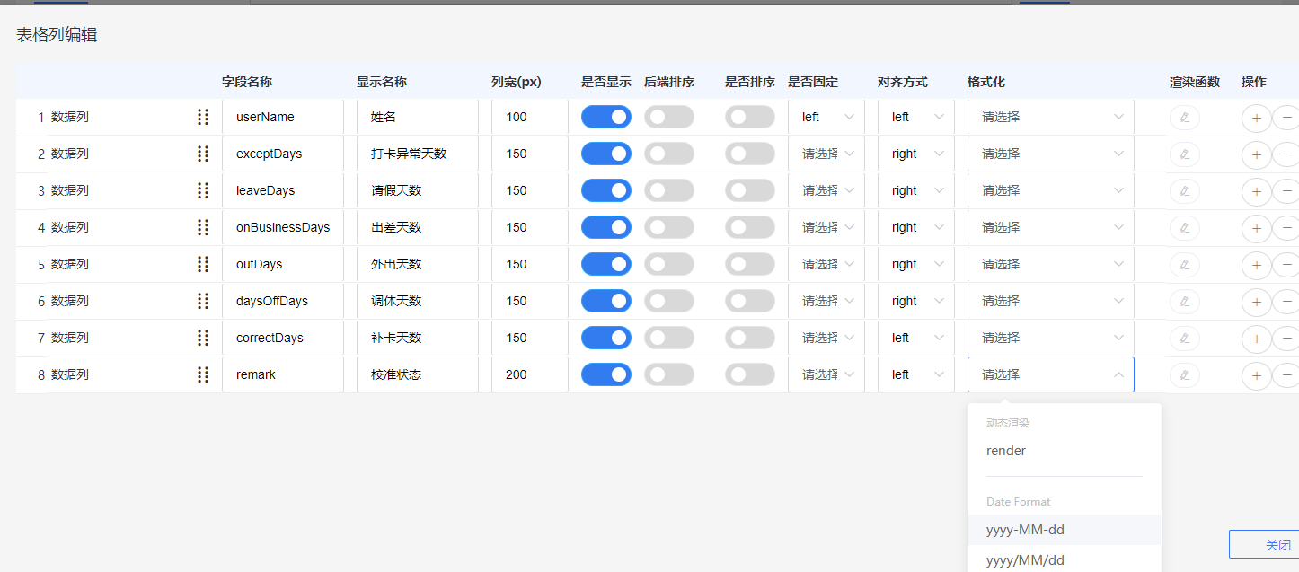 表格列的字段配置,可自定义配置绑定的对应数据源字段、显示名称、宽度等。
