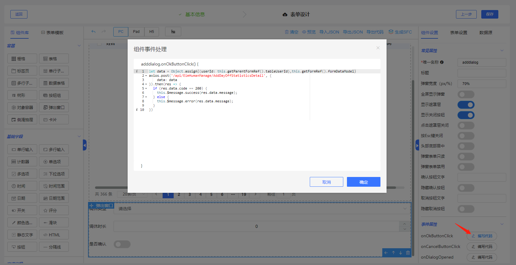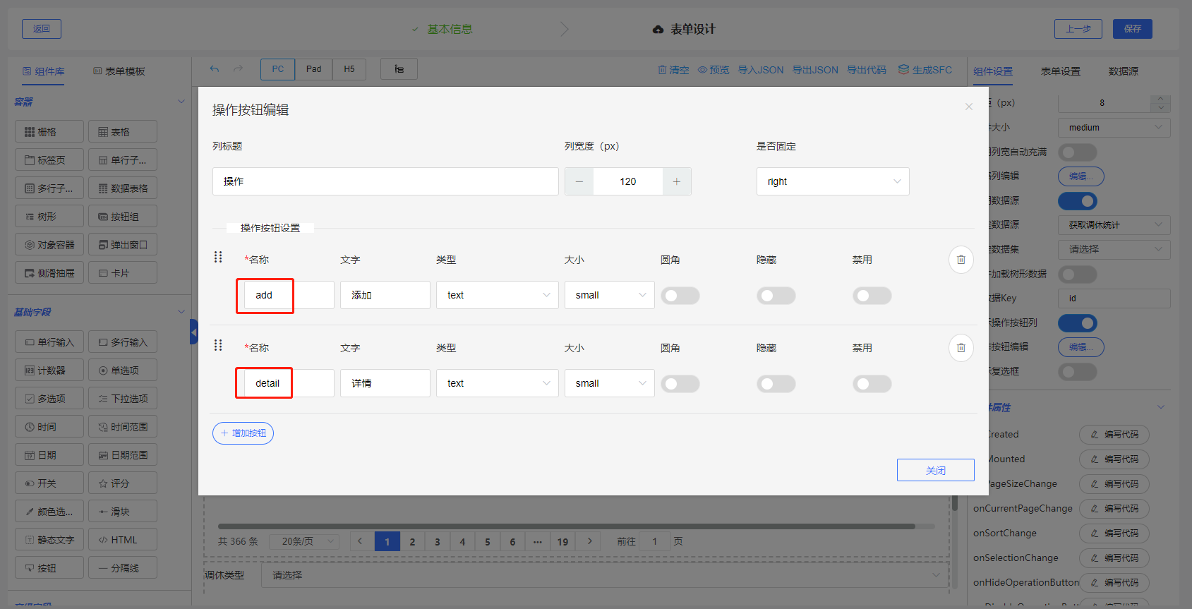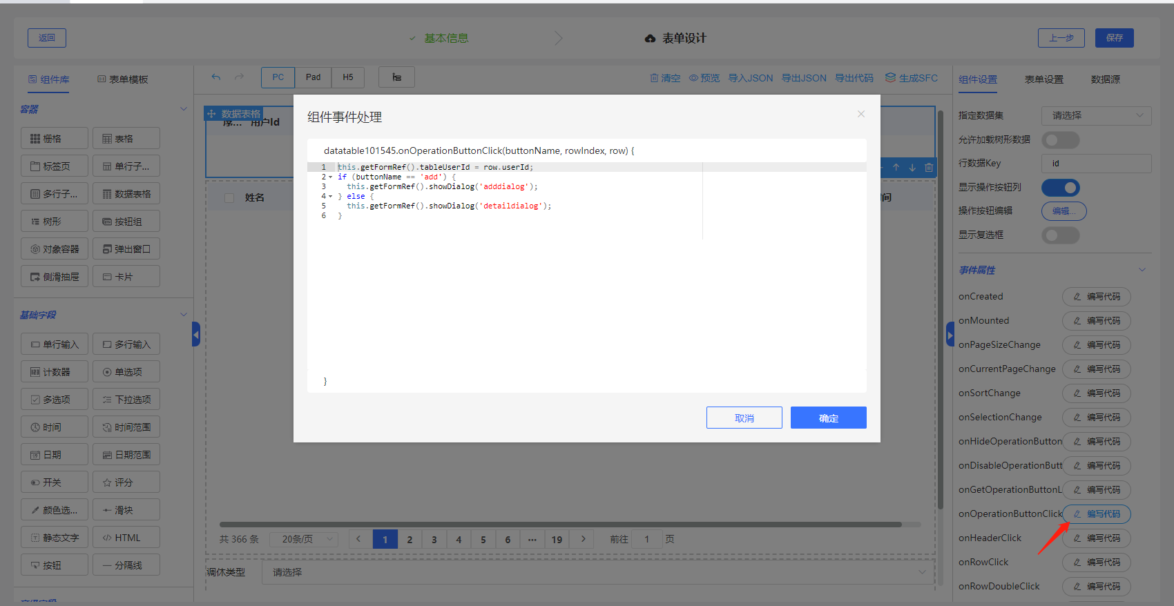 buttonName: 被点击按钮名称,通过下面第二张图处设置(数据表格-操作按钮编辑)。